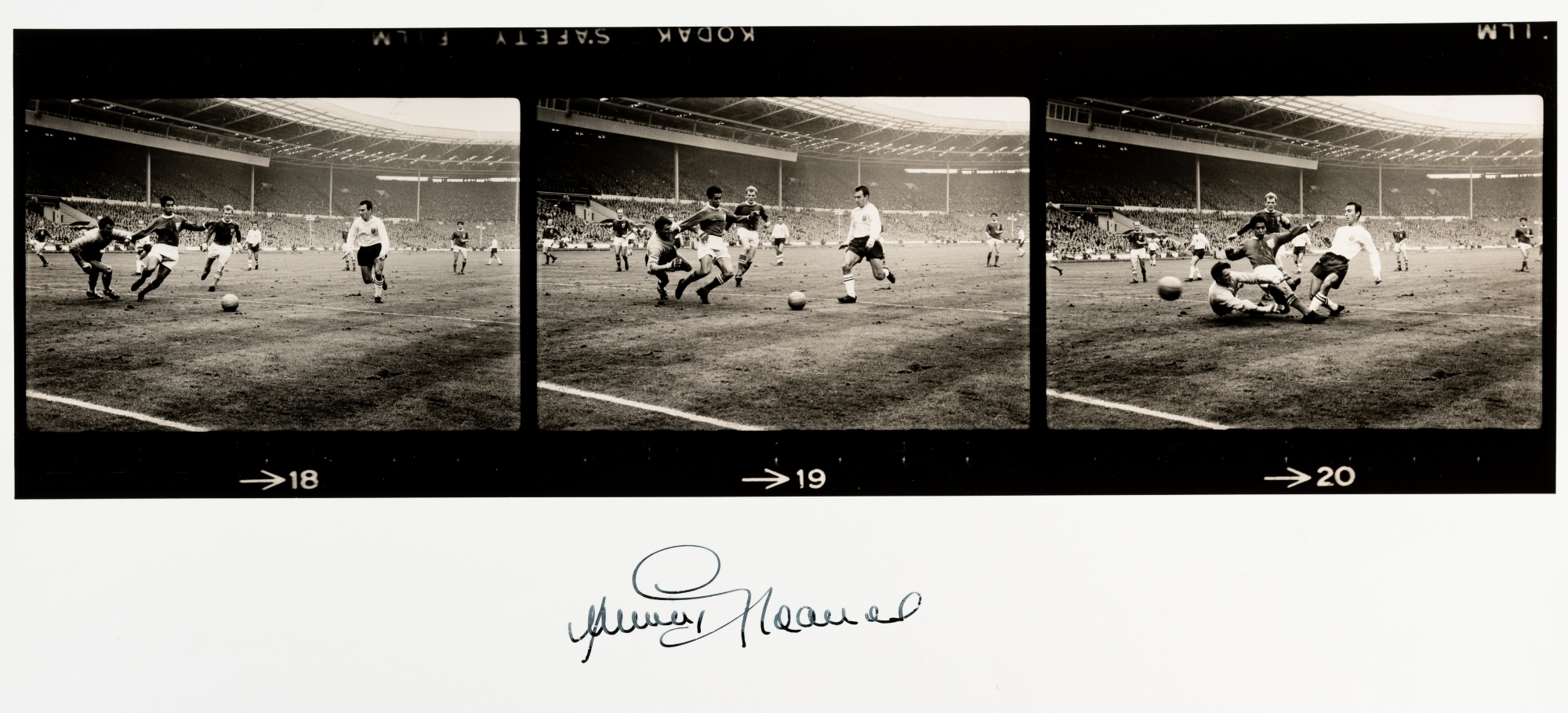 Jimmy Greaves signed large b&w photograph display, 20 by 16in., depicting Greaves playing for England and scoring a goal, with three consecutive images, nicely signed in black pen to the lower clear border