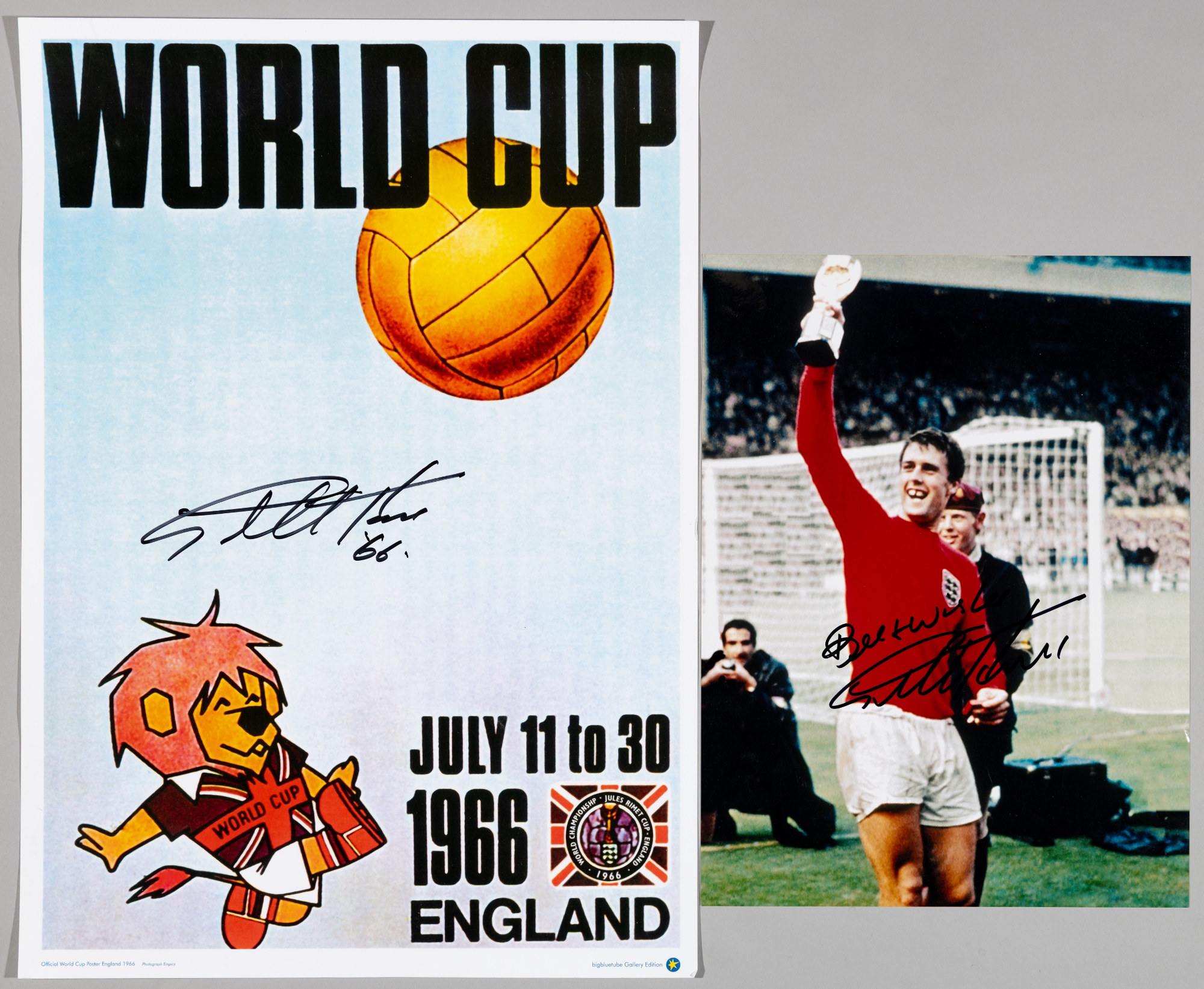 Geoff Hurst signed World Cup 1966 reproduction poster, 22 by 16in., includes signed photograph 16 by 12in. of Geoff Hurst holding the World Cup trophy, (2)