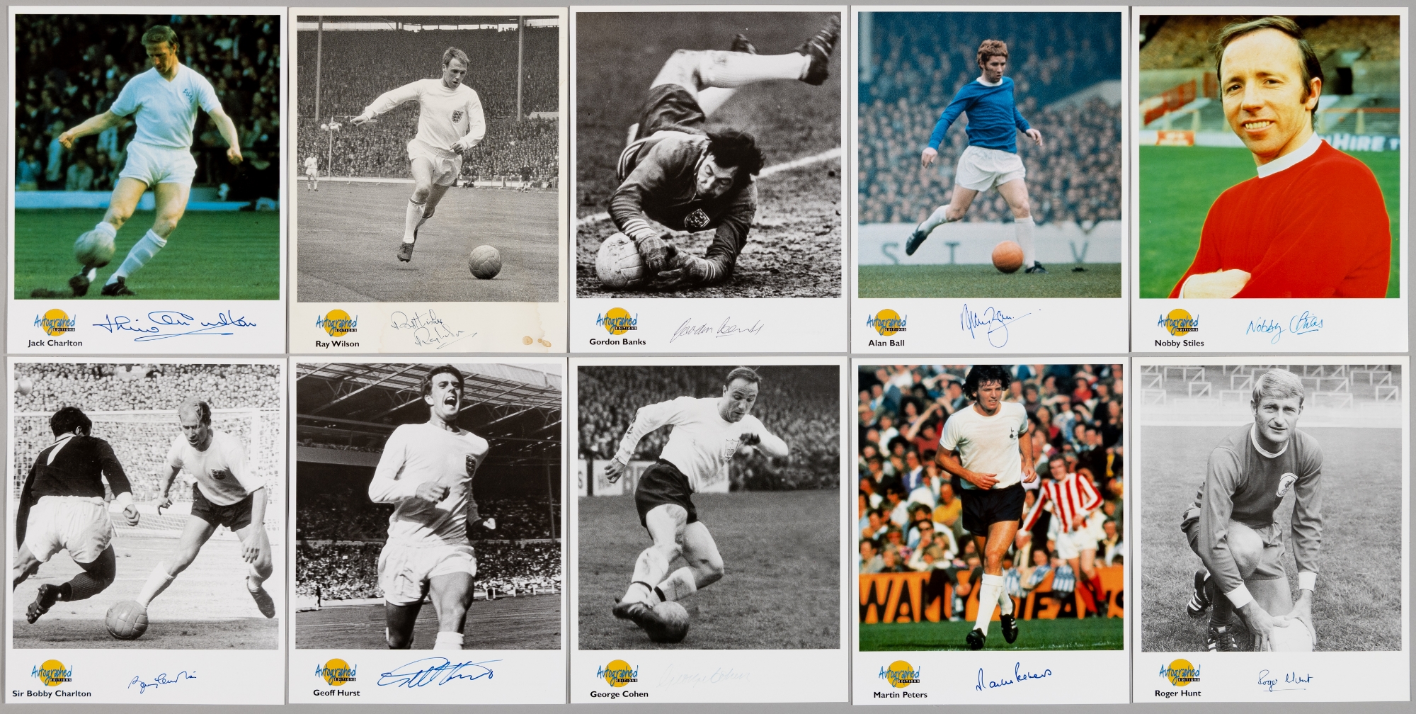 Set of ten Autograph Editions photographs signed by England 1966 World Cup winners, each 10 by 8in., comprising: Gordon Banks, George Cohen, Ray Wilson, Jack Charlton, Alan Ball, Nobby Stiles, Bobby Charlton, Martin Peters, Geoff Hurst and Roger Hunt, nicely signed to the lower clear border, all together in the original plastic wallets and binder with covering C.O.A as issued.