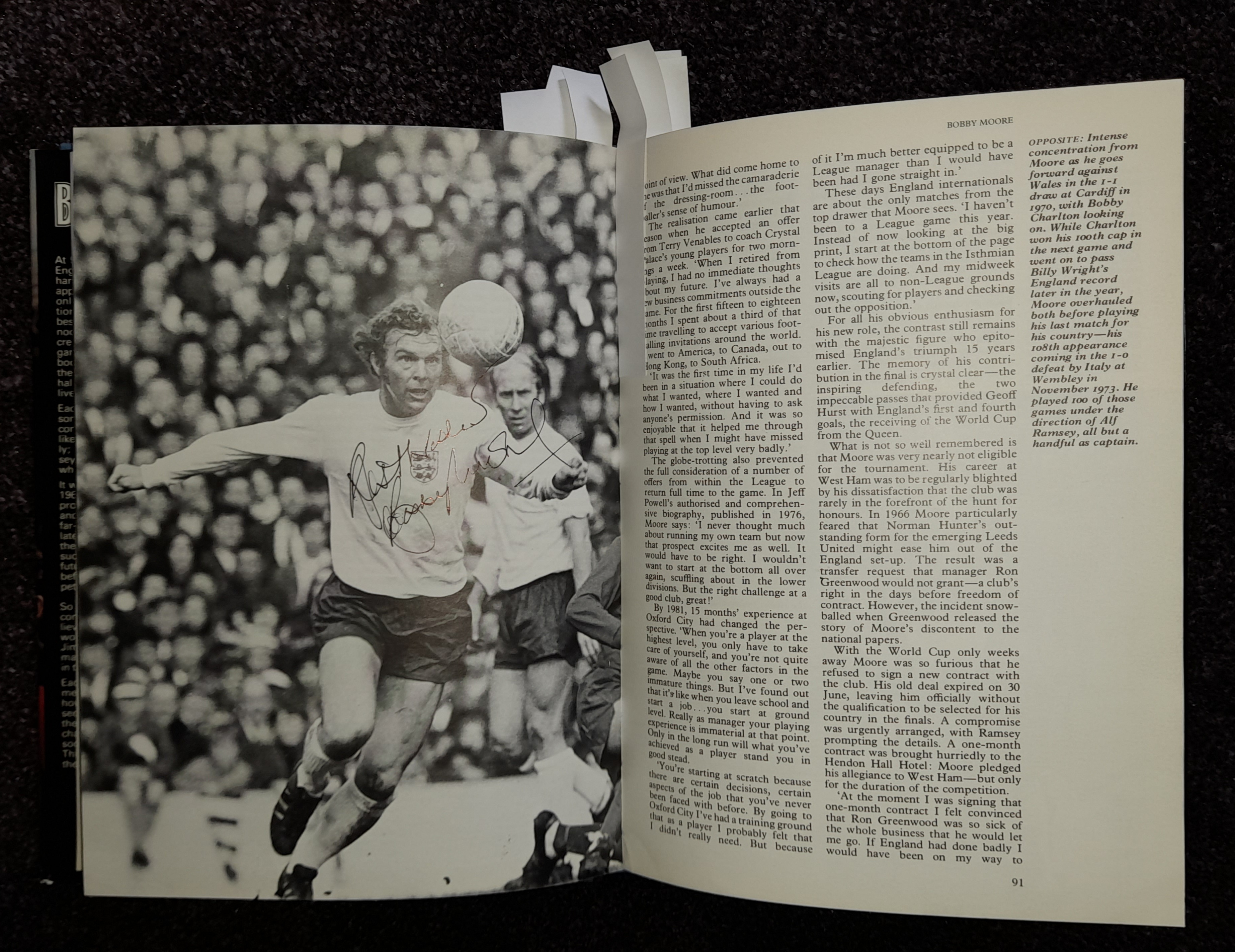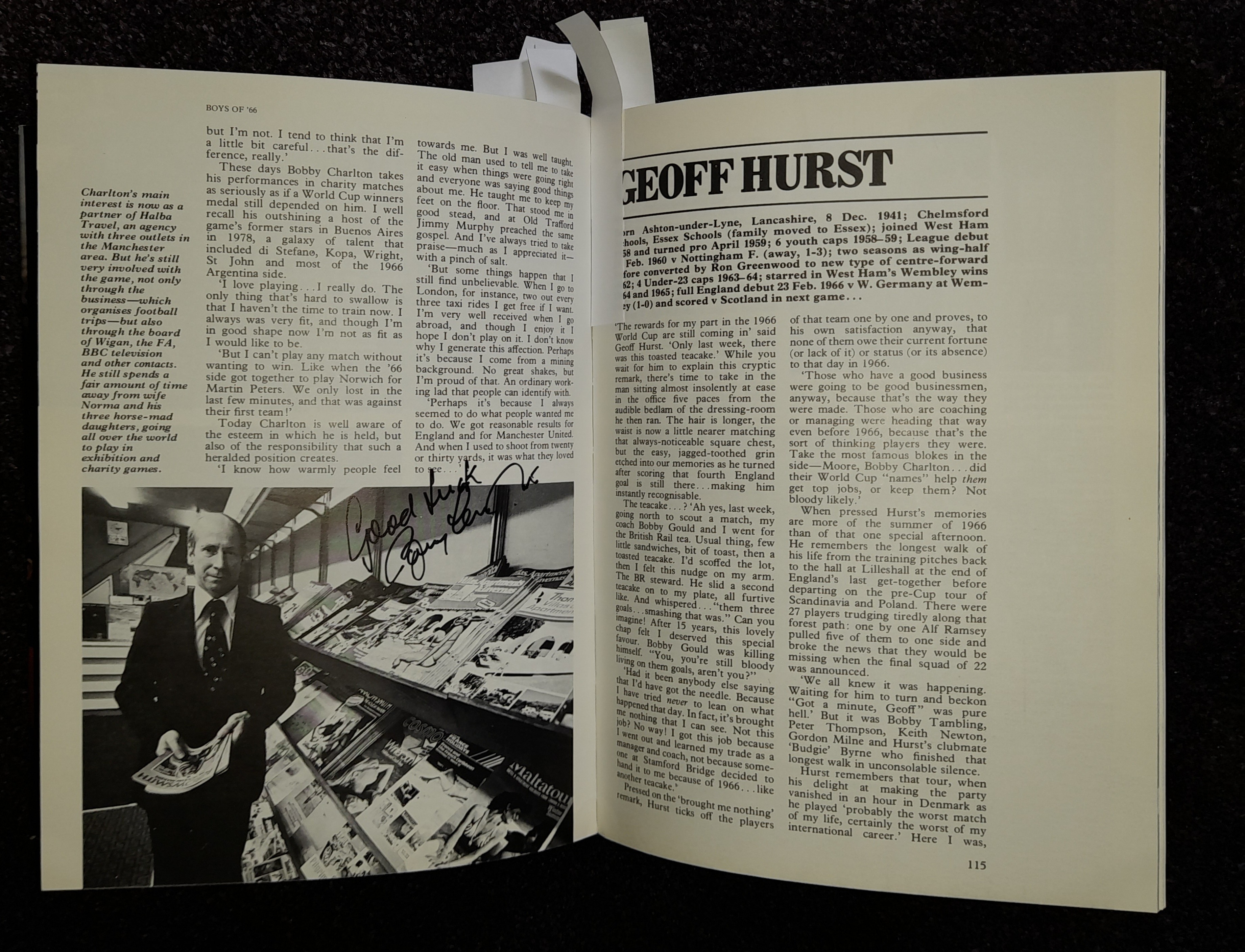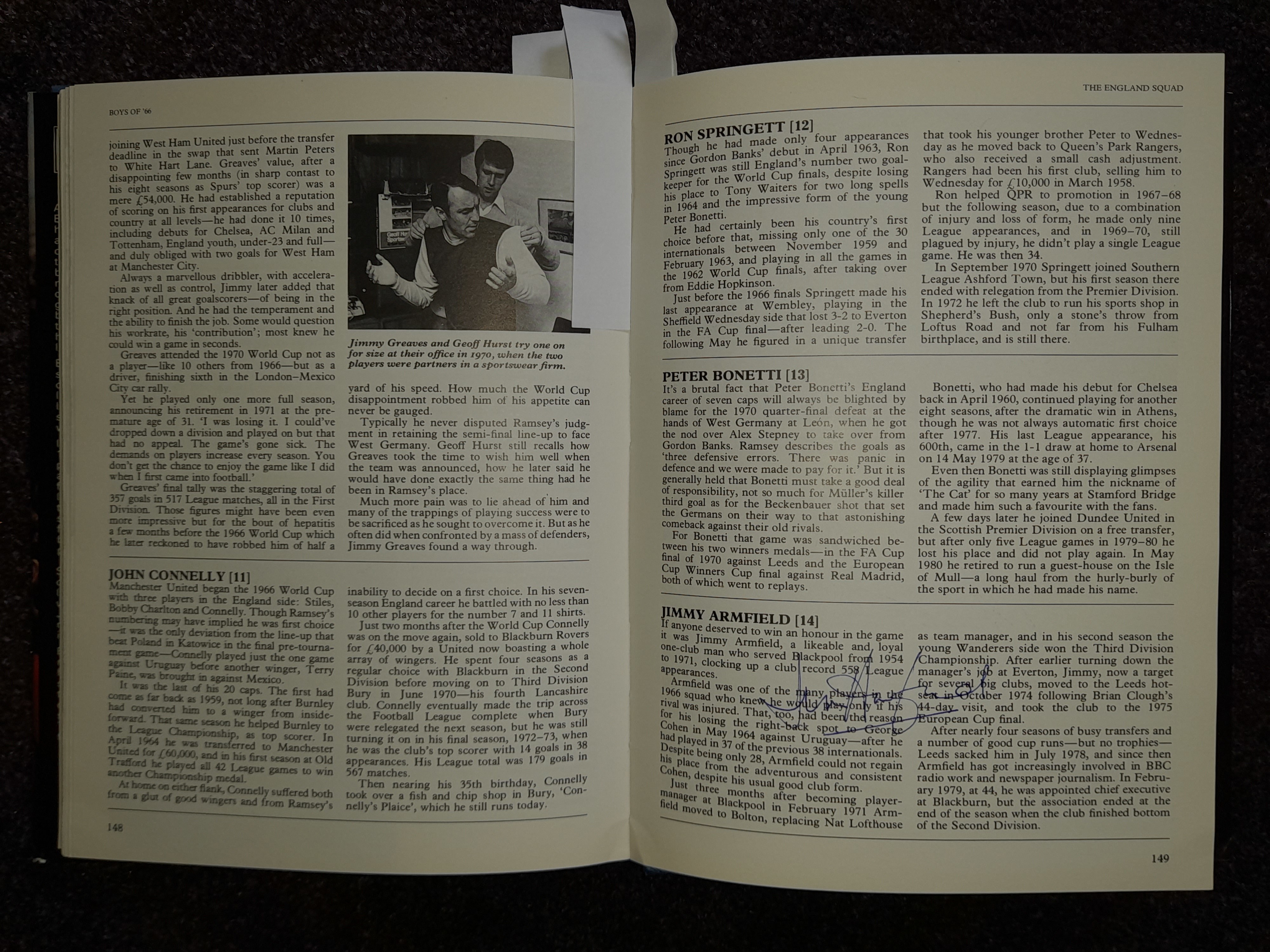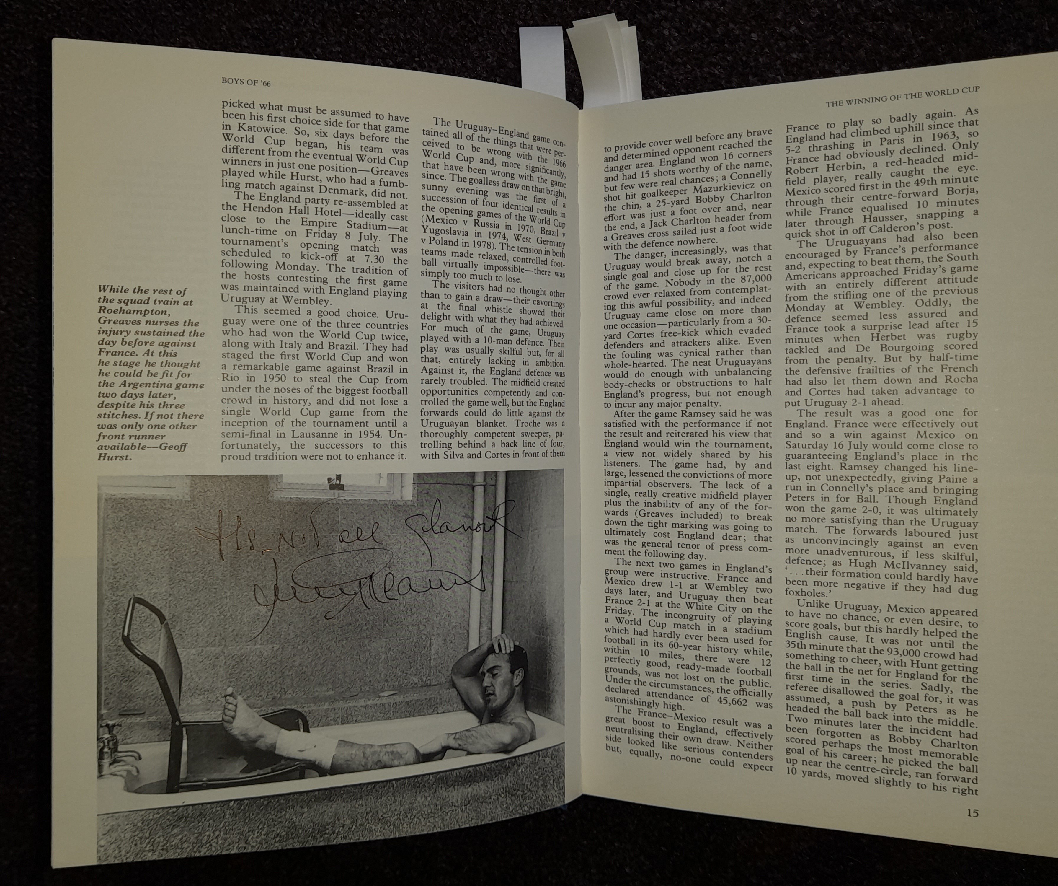 "Boys of 66" book featuring the autographs of the squad including Bobby Moore three times, written by Martin Tyler it covers the England team that won the World Cup – then and now. Signed to first page by Bobby Charlton, Bobby Moore, Nobby Stiles, Jack Charlton, Geoff Hurst, Alan Ball, Roger Hunt, George Cohen, Ray Wilson, Martin Peters, Gordon Banks and Sir Kenneth Wolstenholme with his famous quote with the following title page signed by Peter Bonetti & Jimmy Greaves. Page 14 Jimmy Greaves has signed upon an image of himself in the Spurs bath with foot up on chair and bandaged with him adding “It's not all glamour”. Page 69 image of Moore, Hurst & Peters signed by Bobby, whose again signed an action image of himself playing for England on page 90. Bobby Charlton has signed for a second time across image of himself in his old travel agents shop, with Jimmy Armfield, Gerry Byrne & Ian Callaghan signing in the squad section towards back of the book