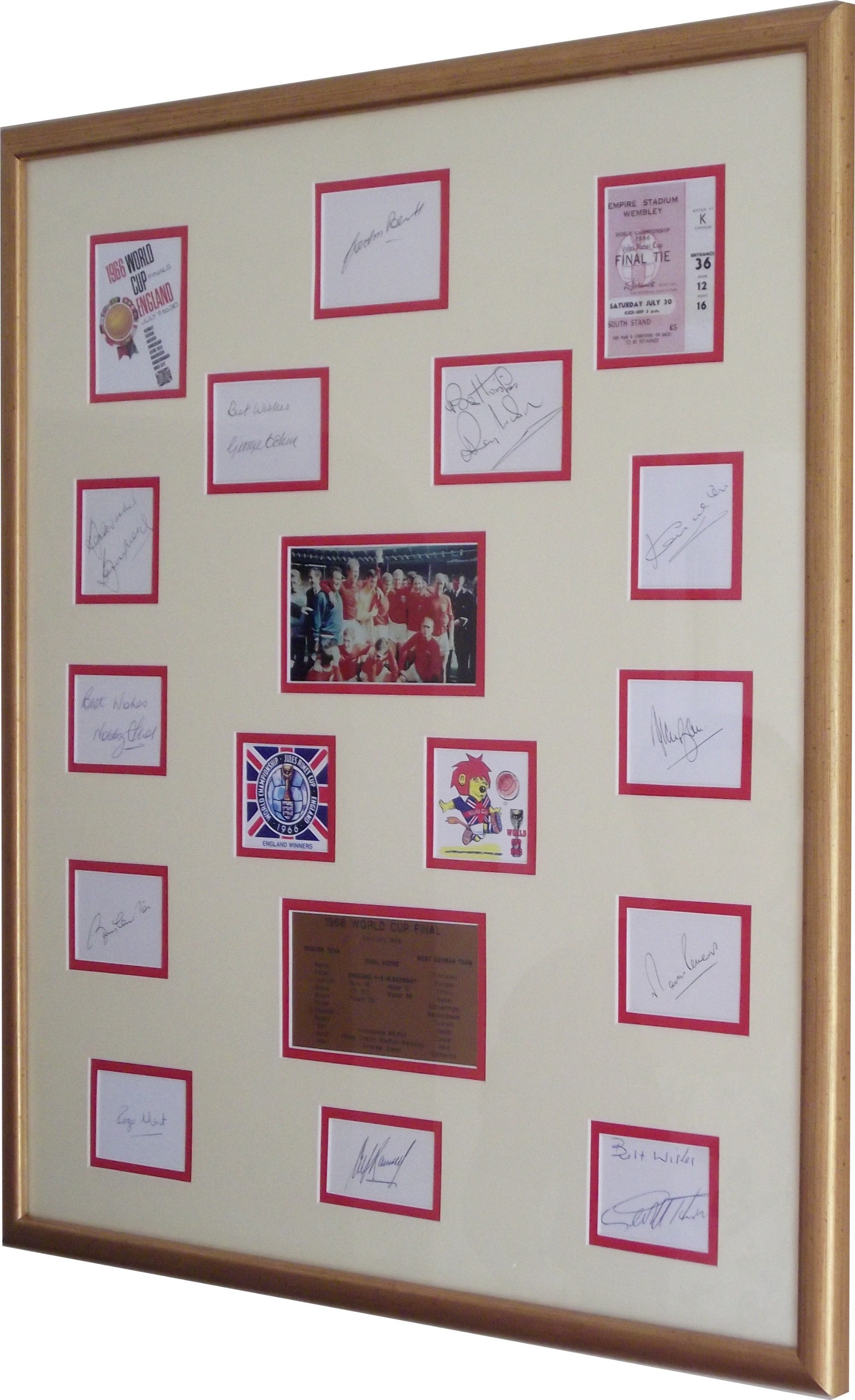England 1966 World Cup winning players and manager signed & framed display, measuring 74 by 66cm, features 12 cards signed by players Gordon Banks, Ray Wilson, George Cohen, Jack Charlton, Bobby Moore (c), Alan Ball, Nobby Stiles, Bobby Charlton, Martin Peters, Roger Hunt, Geoff Hurst plus manger Sir Alf Ramsey along with images and engraved plaque with match details, comes with COA