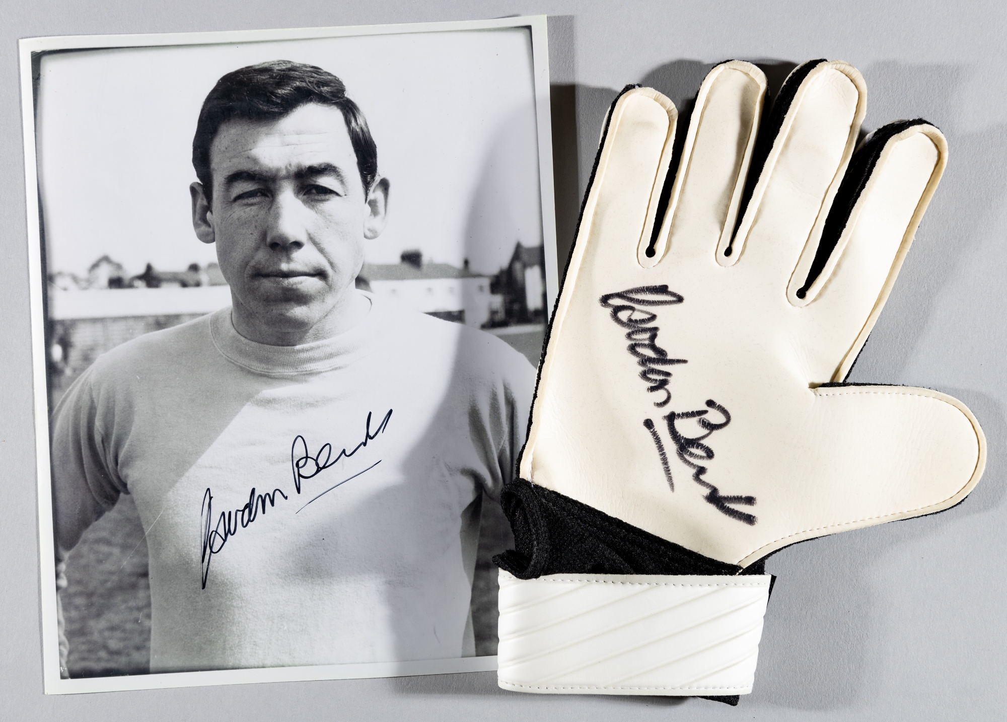 Gordon Banks signed 10 by 8in. photograph and goalkeeping glove, b&w photo signed in fine marker, the glove signed in black marker to white palm (2)