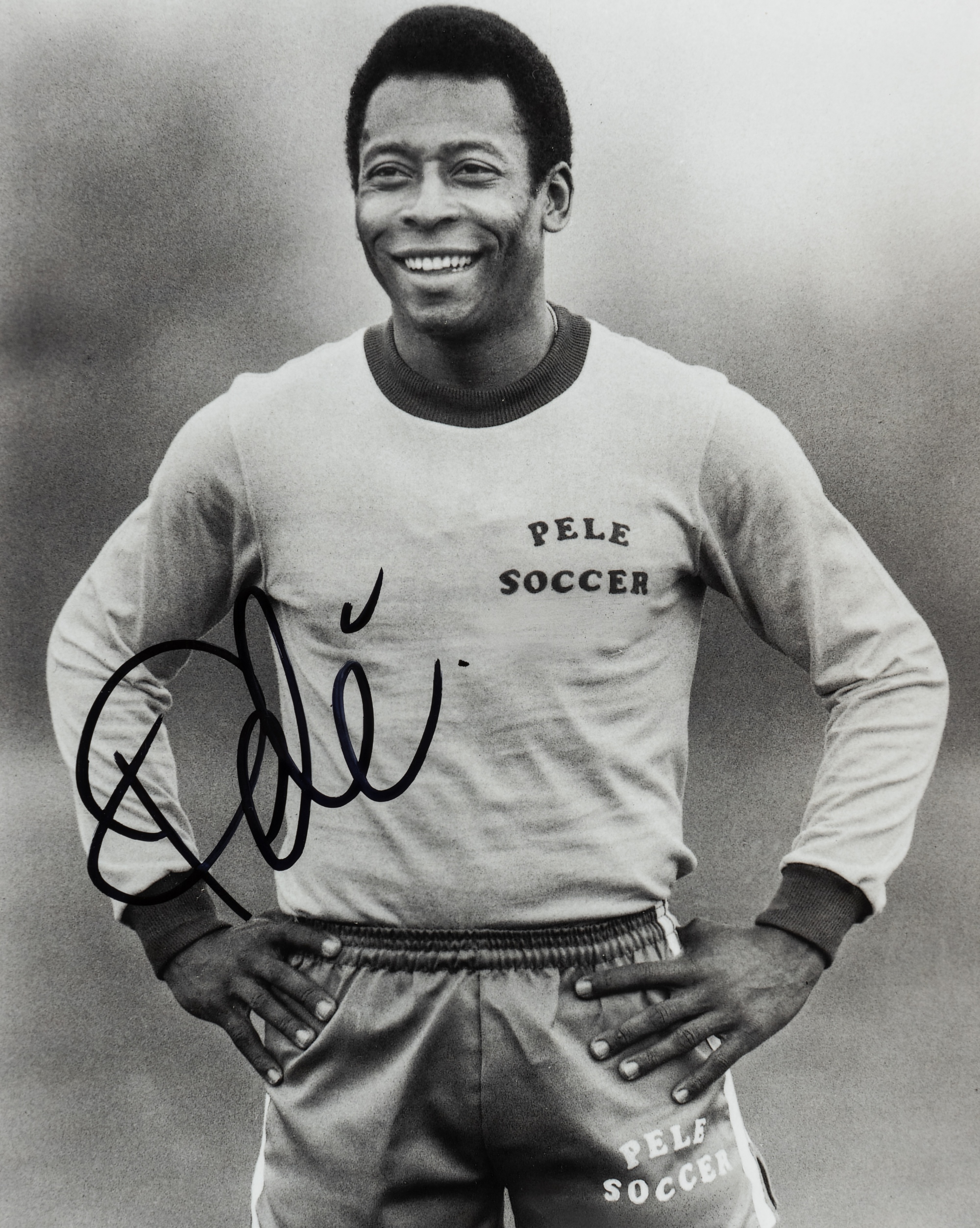 Pele signed b&w photograph, signed in black marker, 10 by 8in.,