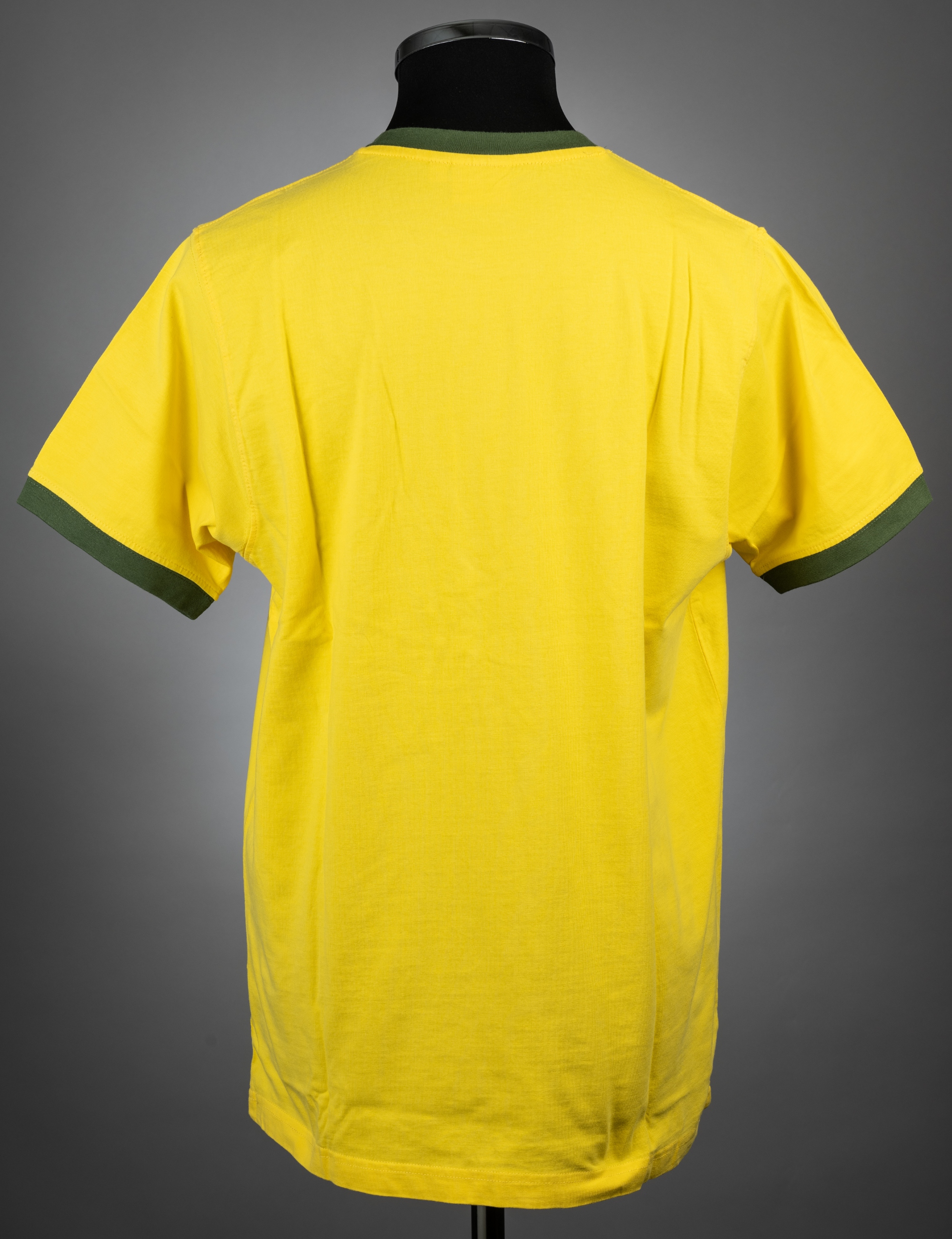 Pele signed yellow Brazil retro jersey, Re-Take, short-sleeved with national emblem, signed in black marker pen on front, size L, with A1 Sporting M