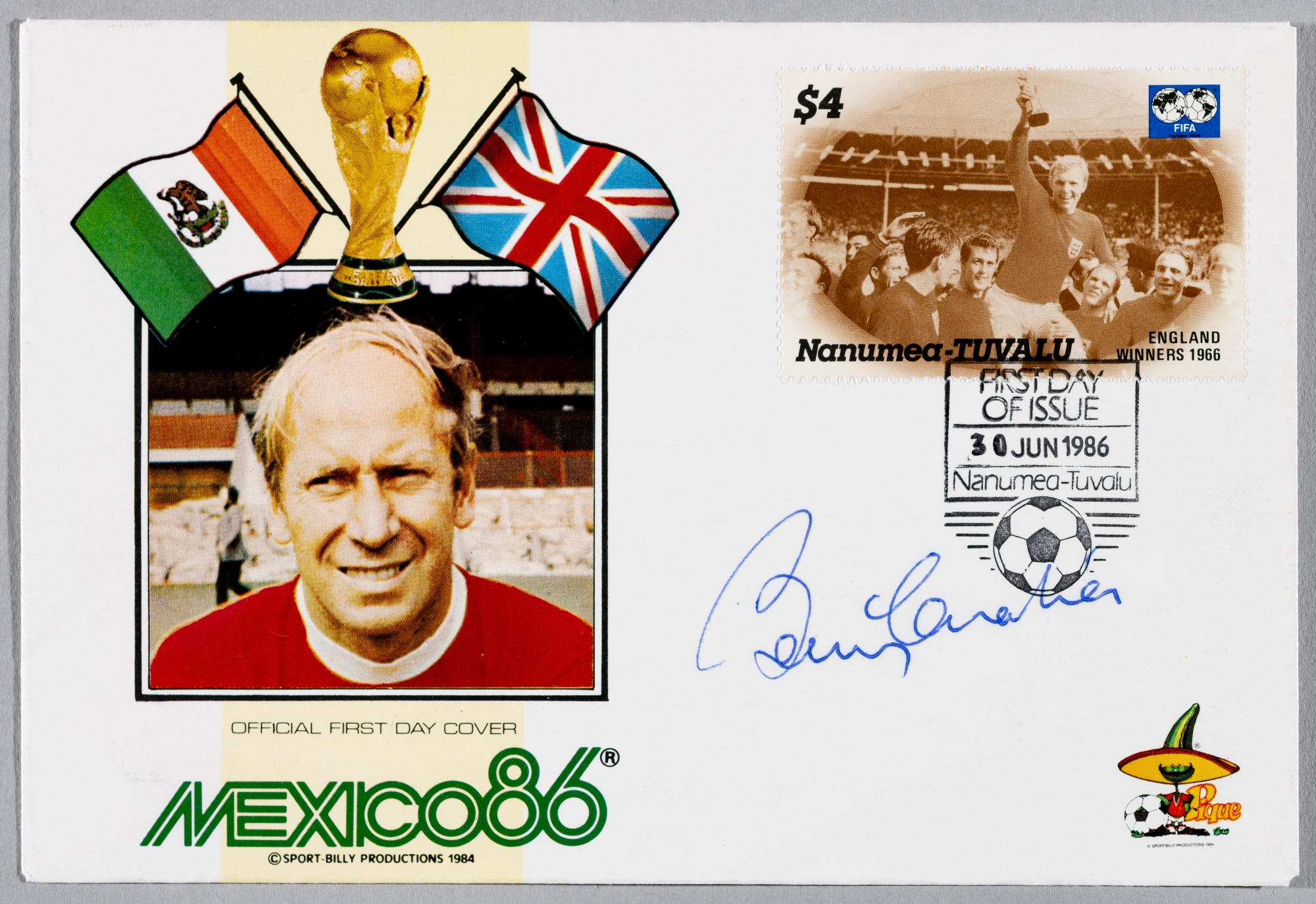 BOBBY CHARLTON WORLD CUP MEXICO 1986 AUTOGRAPHED FOOTBALL FIRST DAY COVER, ORIGINAL FOOTBALL FIRST DAY COVER COMMEMORATING THE 1986 FOOTBALL WORLD CUP, NICELY AUTOGRAPHED IN BLUE INK TO THE CLEAR CENTRAL PORTION OF THE COVER BY FORMER ENGLAND RECORD GOALSCORER BOBBY CHARLTON, POSTMARKED 30th JUNE 1986, THE STAMP BEARING A DEPICTION OF ENGLAND’S 1966 WORLD CUP VICTORY. VERY GOOD CONDITION. Sir Robert Charlton CBE (born 11 October 1937) is an English former footballer who played as a midfielder. He is regarded as one of the greatest players of all time, and an essential member of the England team who won the World Cup in 1966, the year he also won the Ballon d’Or. He played almost all of his club football at Manchester United (making 758 appearances) and in 1968, he captained the Manchester United team that won the European Cup, scoring two goals in the final to help his team be the first English side to win the competition. He is United's second all-time leading goal scorer (249), being surpassed by Wayne Rooney, and held the distinction of being England's all-time top goal scorer (49) from May 1968 to September 2015, when again Wayne Rooney surpassed his record.