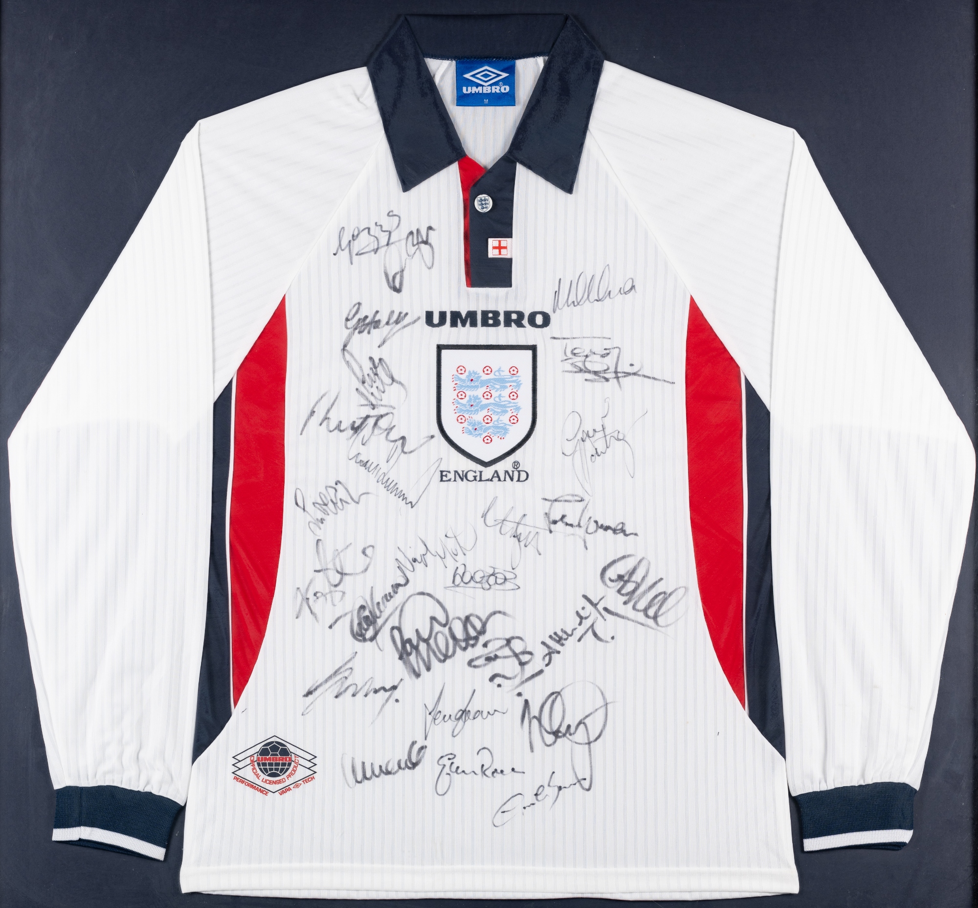 Squad-signed white England replica jersey, circa 1998, Umbro, long-sleeved with England three lion emblem and England, Umbro logo, size M, signed in black marker pen to front by approximately 24 squad members, including Sheringham, Seamen, and others, mounted, glazed and framed, overall 86 by 90cm.