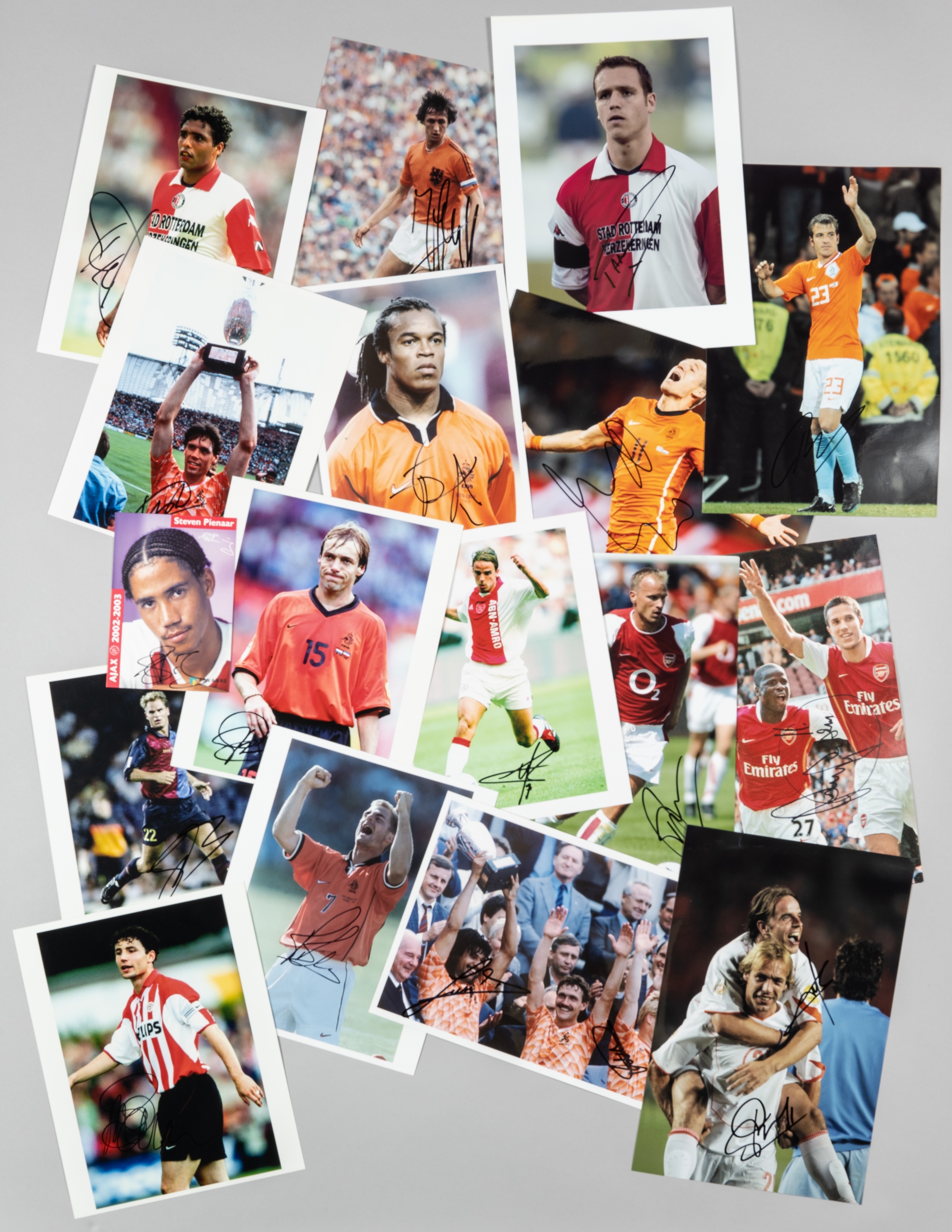 16 signed photographs of Dutch football legends, mainly colour, comprising Johan Cruyff, Ruud Gullit, Ronald Koeman, Marco van Basten, Arjen Robben, Edgar Davids, Dennis Bergkamp, Robin van Persie, Ronald De Boer, Frank De Boer, Paul Bosvelt, Andy van der Meyde, Mark van Bommel, Pierre van Hooijdonk, Patrick Paauwe and Rafael van de Vaart, various sizes up to 8 by 12in.; the lot also including an Ajax publicity card signed by the South African footballer Steven Pienaar (17)