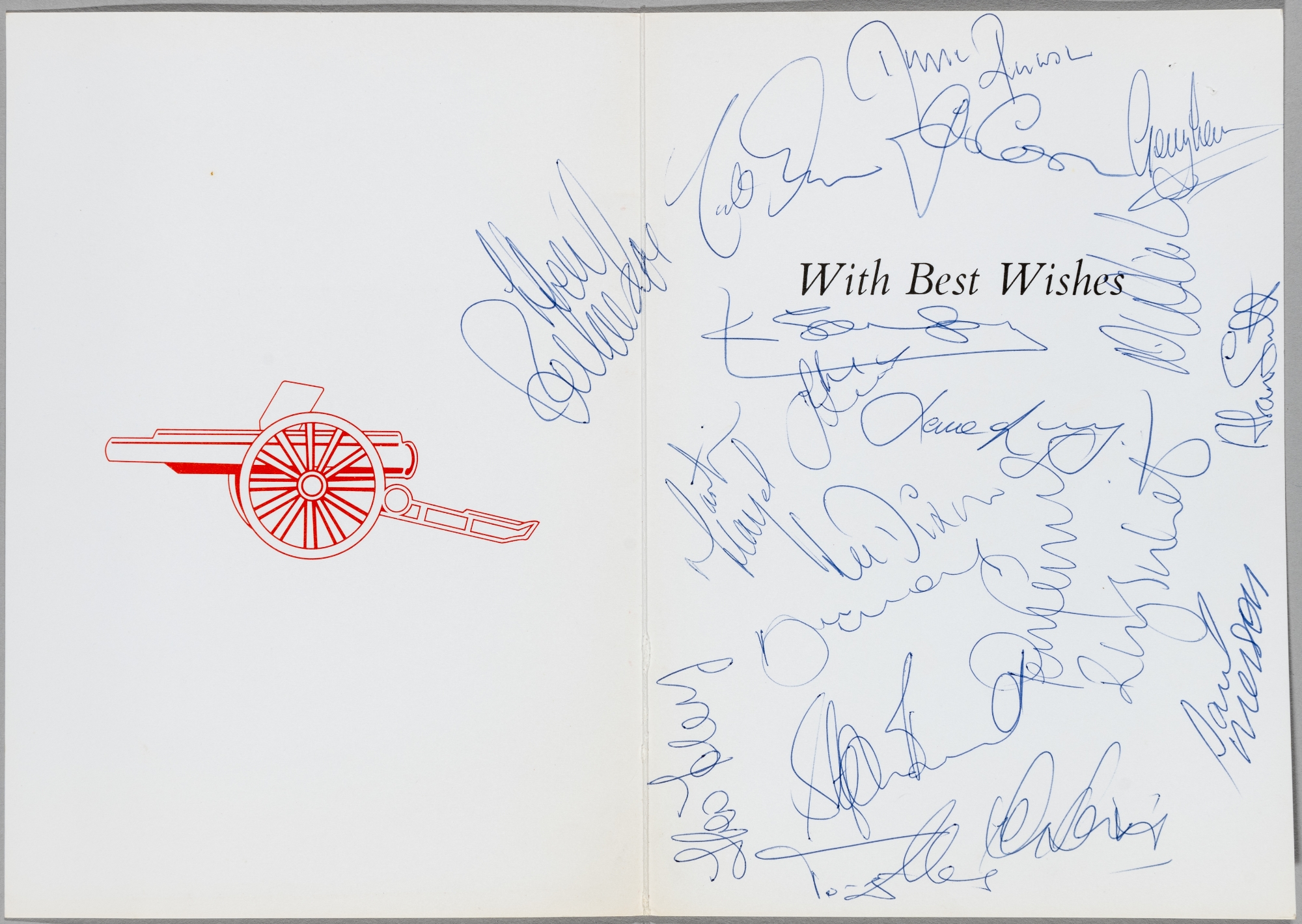 Autographed Arsenal FC card signed by the Football League Division One championship wining squad, season 1988-89, the Arsenal FC card with club crest, signed internally by 20 squad members in blue pen, including Adams, Dixon, Merson, O'Leary, Hayes, Groves, Smith, and others, sold with Arsenal FC letterhead letter and club information brochure season 1898-1990, (qty)