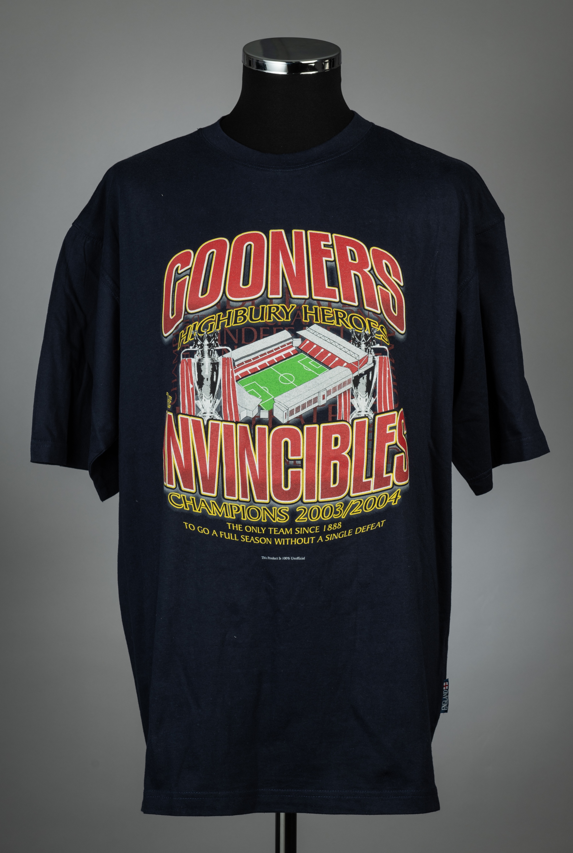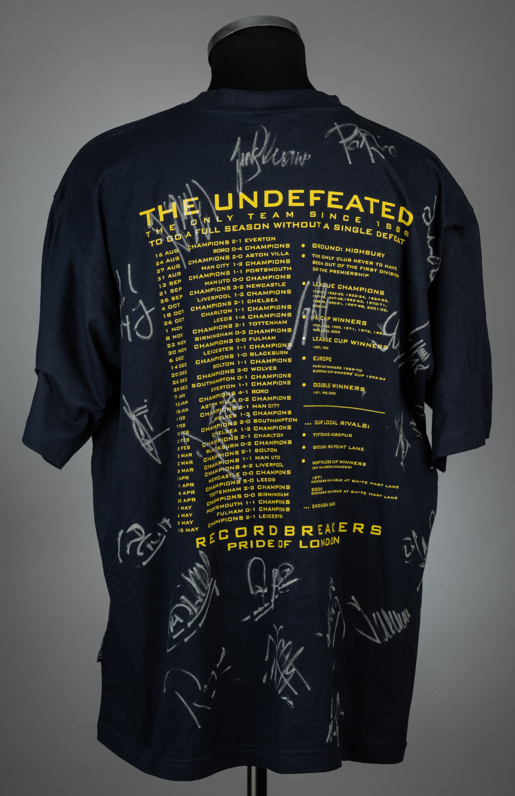 Arsenal full Invincible squad signed 'The Invincibles' 2004 navy t-shirt, bearing transfers on the front and reverse, signed silver marker pen on reverse, size XL, bears Bonhams lot tag Provenance: Bonhams Auction, Lot 745