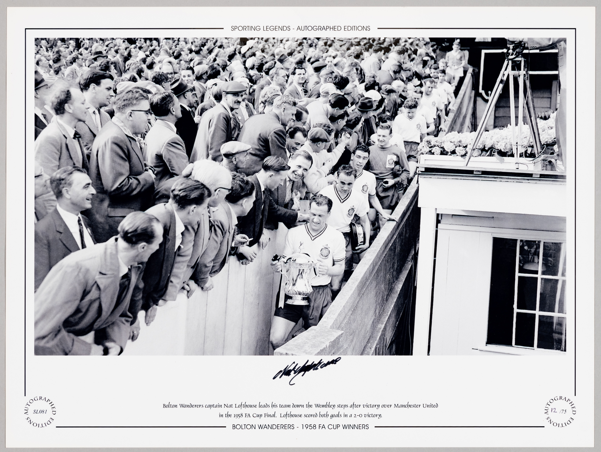 Bolton Wanderers 1958 F.A Cup winner Nat Lofthouse large 16 by 12in. autographed Limited Edition display photograph, Nat Lofthouse carrying the F.A Cup down the Wembley steps with the trophy having scored both goals in Bolton’s 2-0 victory over Manchester United, with smaller authentication photograph depicting Nat Lofthouse signing the image. Superb large signature of Nat Lofthouse to the lower clear white border.