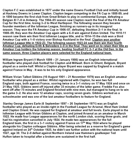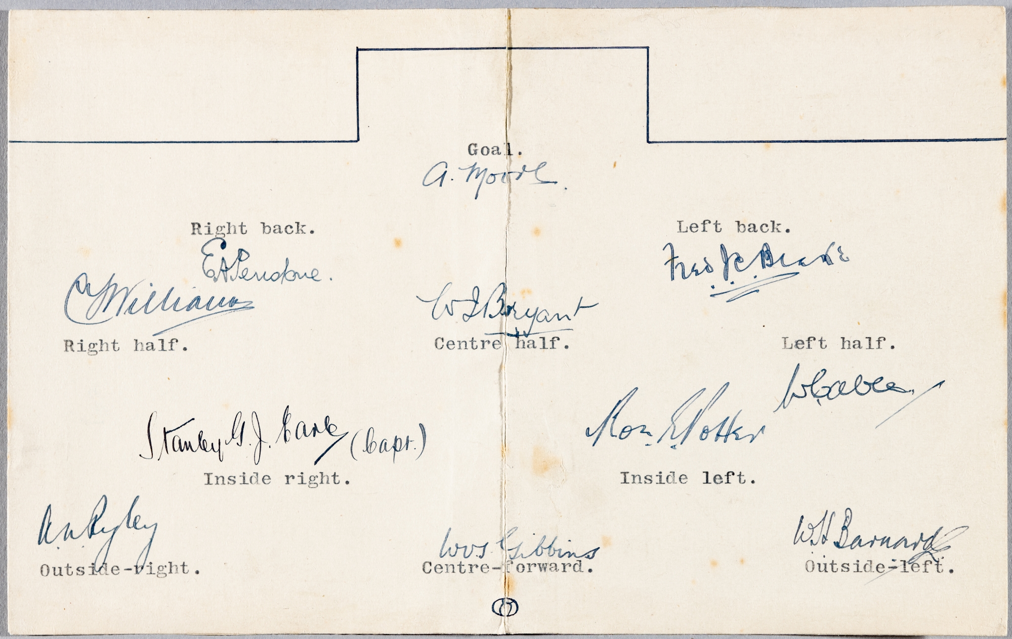 CLAPTON F.C 1923-24 FA AMATEUR CUP WINNERS RARE INK AUTOGRAPHS INCLUDING THREE ENGLAND PLAYERS RARE ORIGINAL AUTOGRAPHED FOLDOVER CARD SIZE 8 ½ BY 5 ½ IN. WITH TYPED TEAM GRID TO THE OPEN INTERIOR, FULLY AUTOGRAPHED IN FOUNTAIN PEN INK BY THE CLAPTON F.C TEAM THAT WERE THE 1923-24 FA AMATEUR CUP WINNERS. BEAUTIFULLY AND UNIFORMLY SIGNED TO THEIR INDIVIDUAL TEAM POSITION BY ALL ELEVEN CLAPTON F.C PLAYERS INCLUDING THE RARE SIGNATURES OF THE TEAM’S THREE ENGLAND INTERNATIONALS. SIGNATURES INCLUDE: STANLEY EARLE (CAPTAIN), VIV GIBBINS, WILLIAM BRYANT, FRED BLAKE, RON POTTER et al. AGE WEAR TO CENTRE FOLD OTHERWISE IN VERY GOOD CLEAN CONDITION. FORMERLY FROM THE COLLECTION OF EARLY 20TH CENTURY AUTOGRAPH COLLECTOR LOUIS B. FREWER. Further details for this lot in the images.