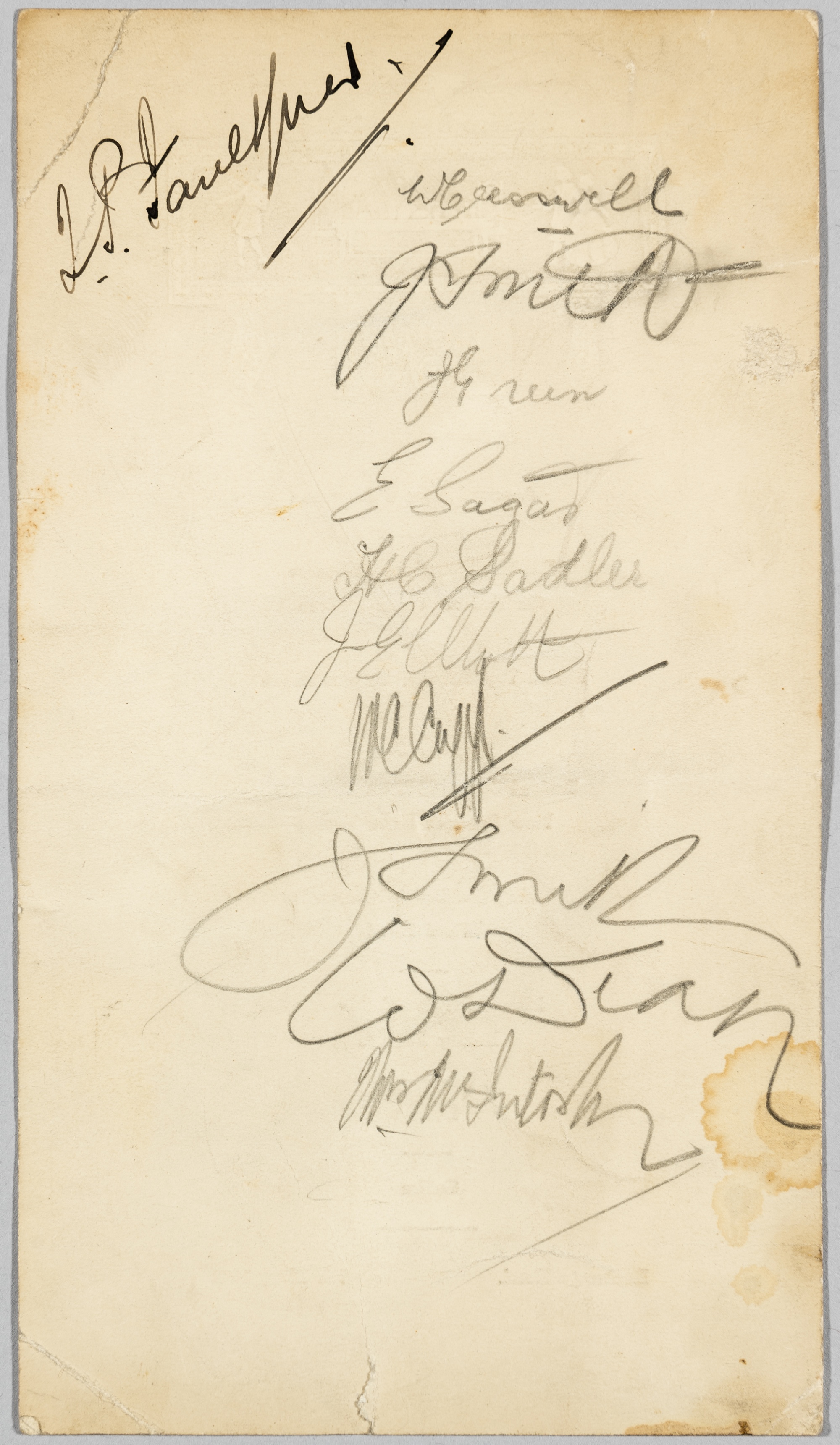 Signed Everton FC Football League Division One Champions menu 1932-33, single card printed on the front and signed in pencil and black ink by 11 att