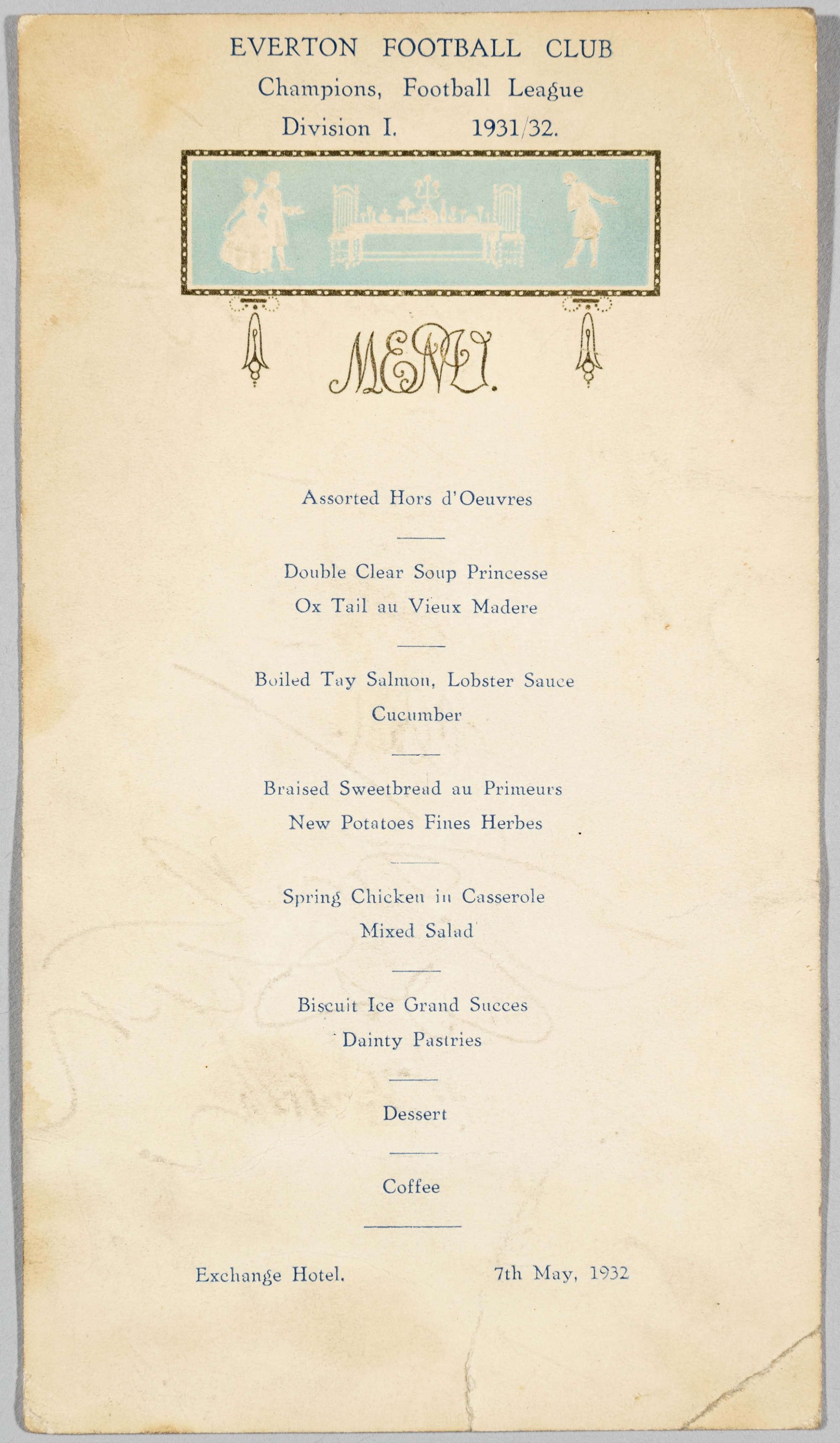 Signed Everton FC Football League Division One Champions menu 1932-33, single card printed on the front and signed in pencil and black ink by 11 attendees, including Dixie Dean and others, bears wear and stains, creases and folds Everton won the League on 56 points from Arsenal on 54 points in 1932-33 season.