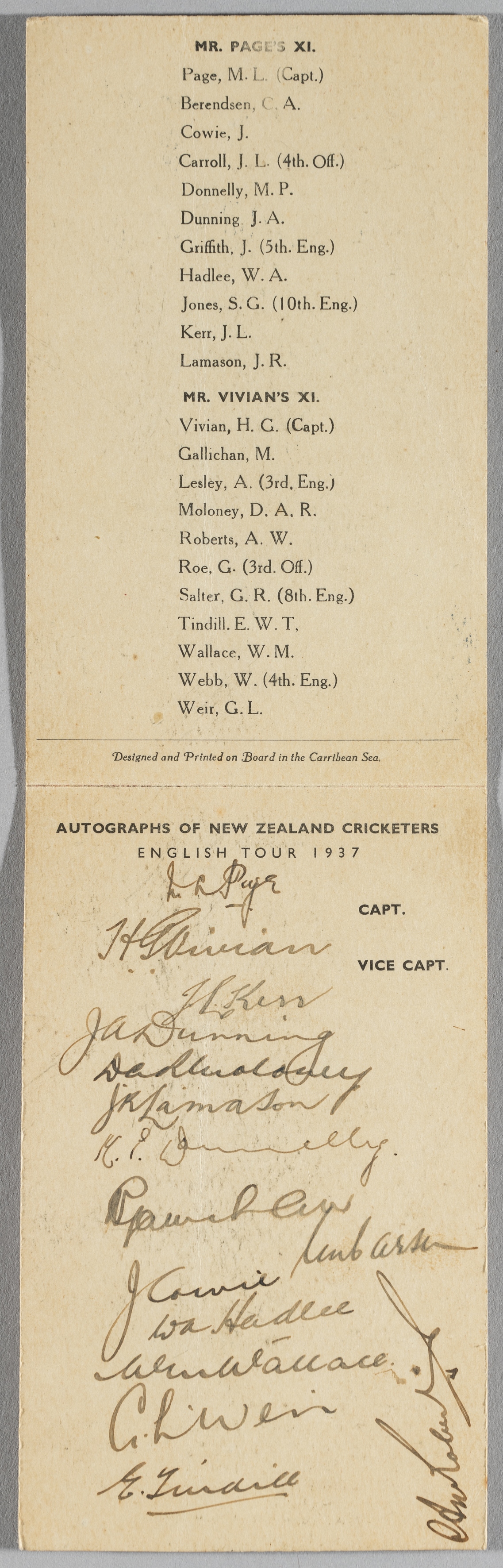 Autographs of the 1937 New Zealand cricket team collected aboard the RMS Arawa en route to England, scorecard of cricket match played on board featuring a list of Mr Page's XI and Mr Vivian's XI teams, with autographs of 15 players in black ink, including Curly Page (captain), Giff Vivian (vice-captain), Jack Kerr, Jack Dunning, Denis Moloney, Jack Lamason, Martin Donnelly, Jack Cowie, Walter Hadlee, Merv Wallace, Lindsay Weir, Eric Tindill, and others, the reverse of the four-page scorecard featuring a profile of Commander T.V. Roberts RNR, good condition with little wear
