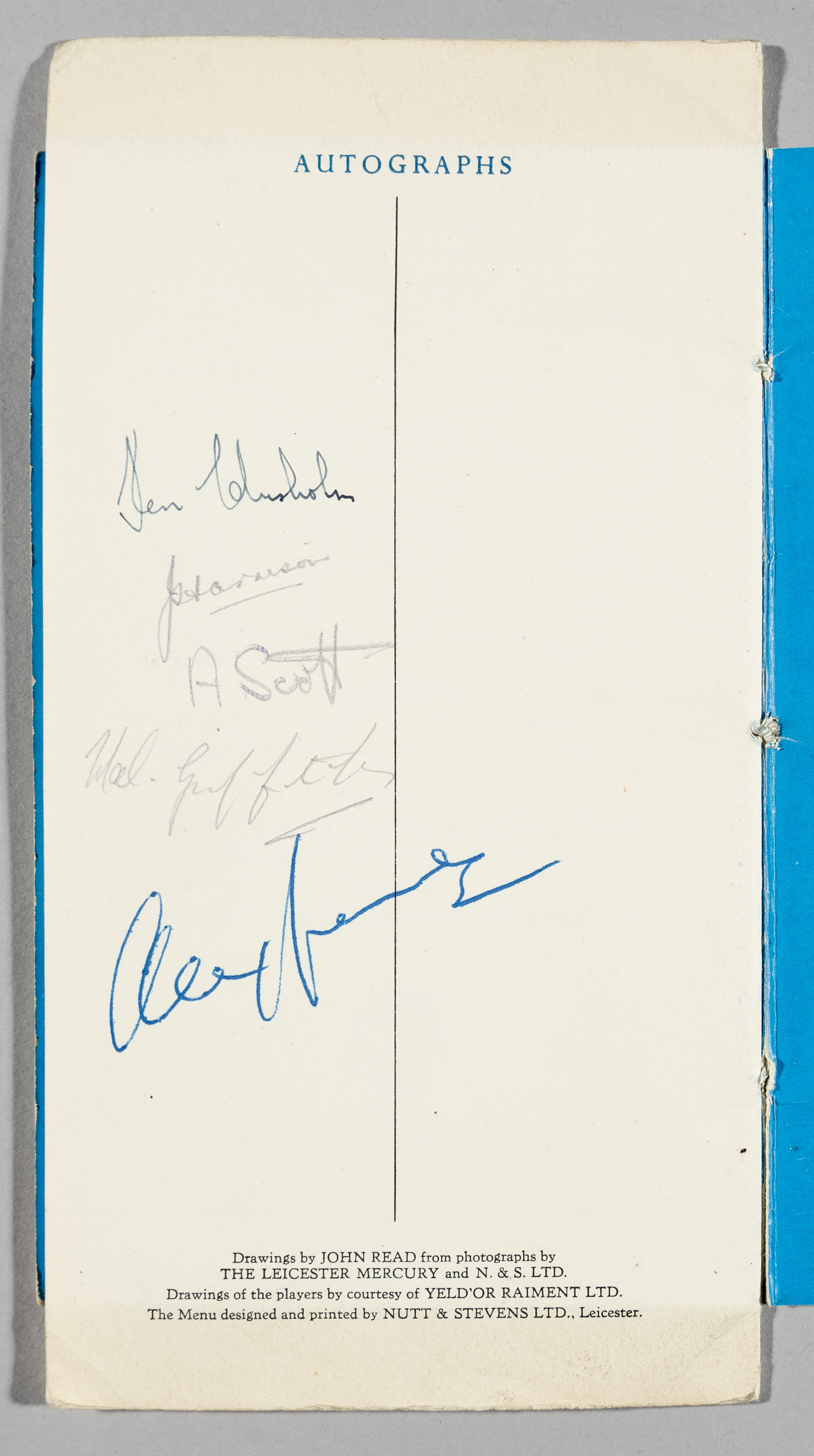 Autographed Leicester City F.A Cup finalists celebration dinner menu, held at The Bell Hotel, Leicester, 9th May 1949, signed in pencil and blue ink on inner back page, signatures include Ken Chisholm, Jimmy Harrison, Sandy Scott, M. Griffiths and possibly Alex James (Arsenal), bears wear and slight discolouration of pages