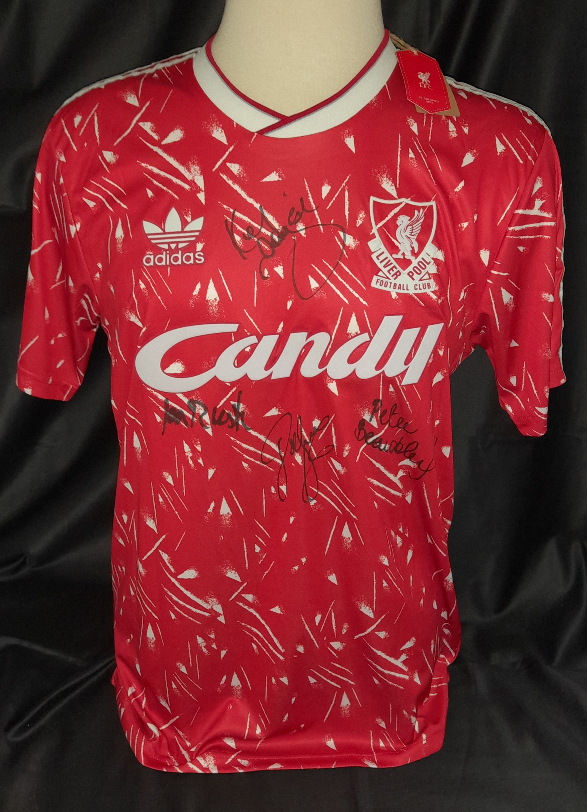 Rare Liverpool Candy sponsored 1989-91 jersey (official club merchandise) signed by four Legends, John Barnes, Ian Rush, Kenny Dalglish and Peter Bear