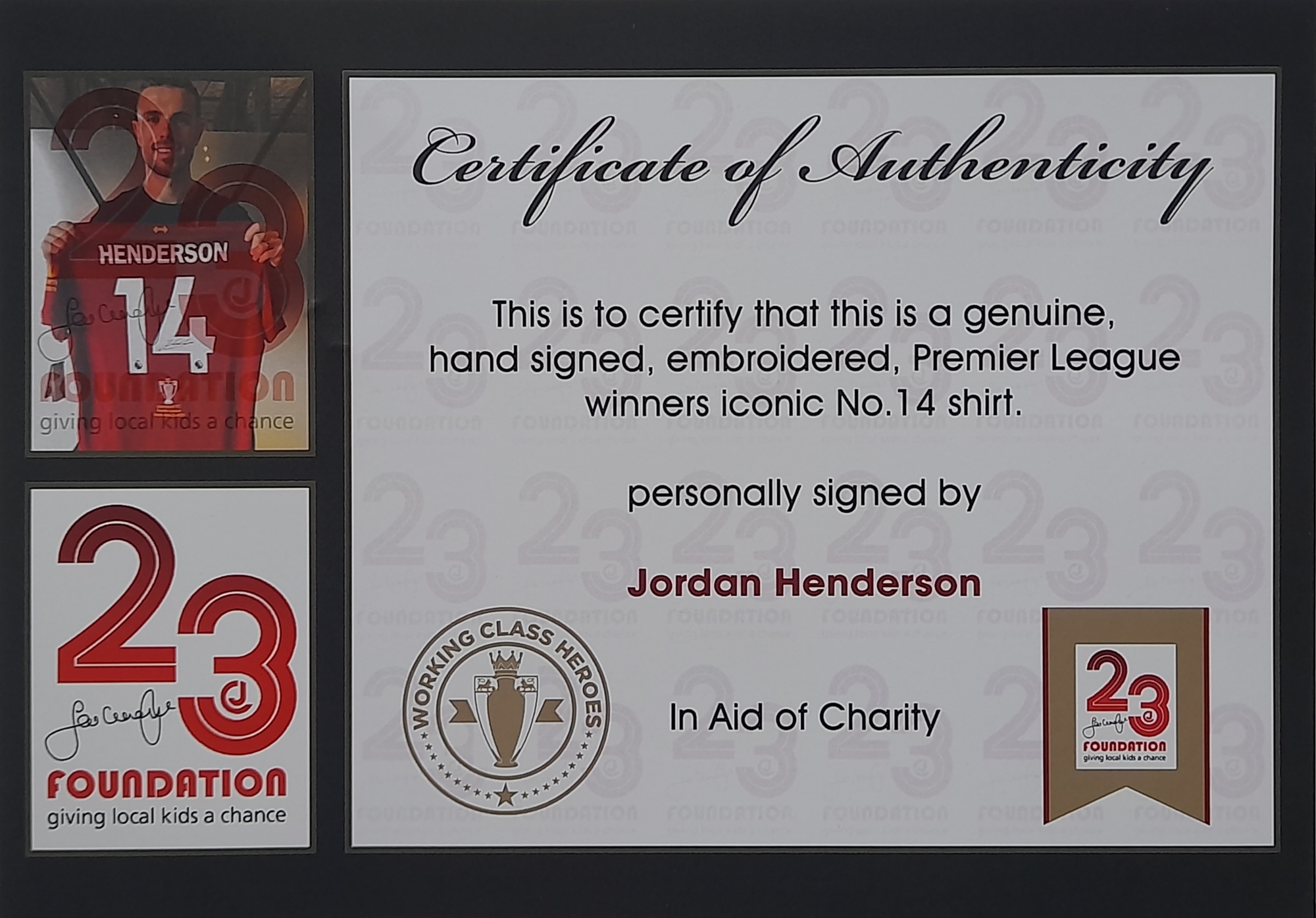 Jordan Henderson Liverpool captain signed & framed 2019 Premier League winners commemorative jersey, with certificate of authenticity and photograph proof from the official Jamie Carragher 23 charity foundation, frame measures 81 by 63cm.
