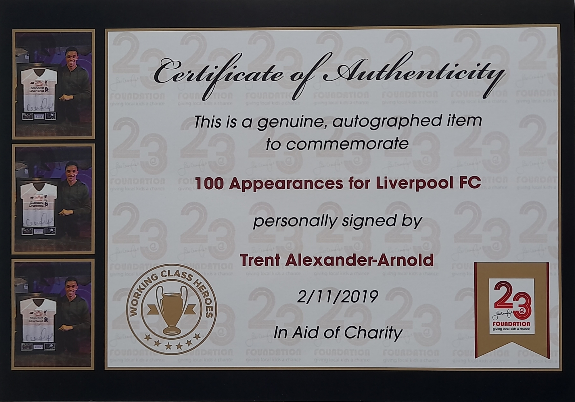 Trent Alexander Arnold Liverpool signed & framed 100th appearance for the first team commemorative jersey, match details embroidered to front, comes with certificate of authenticity and photograph proof from the official Jamie Carragher 23 charity foundation, frame measures 81 by 63cm.
