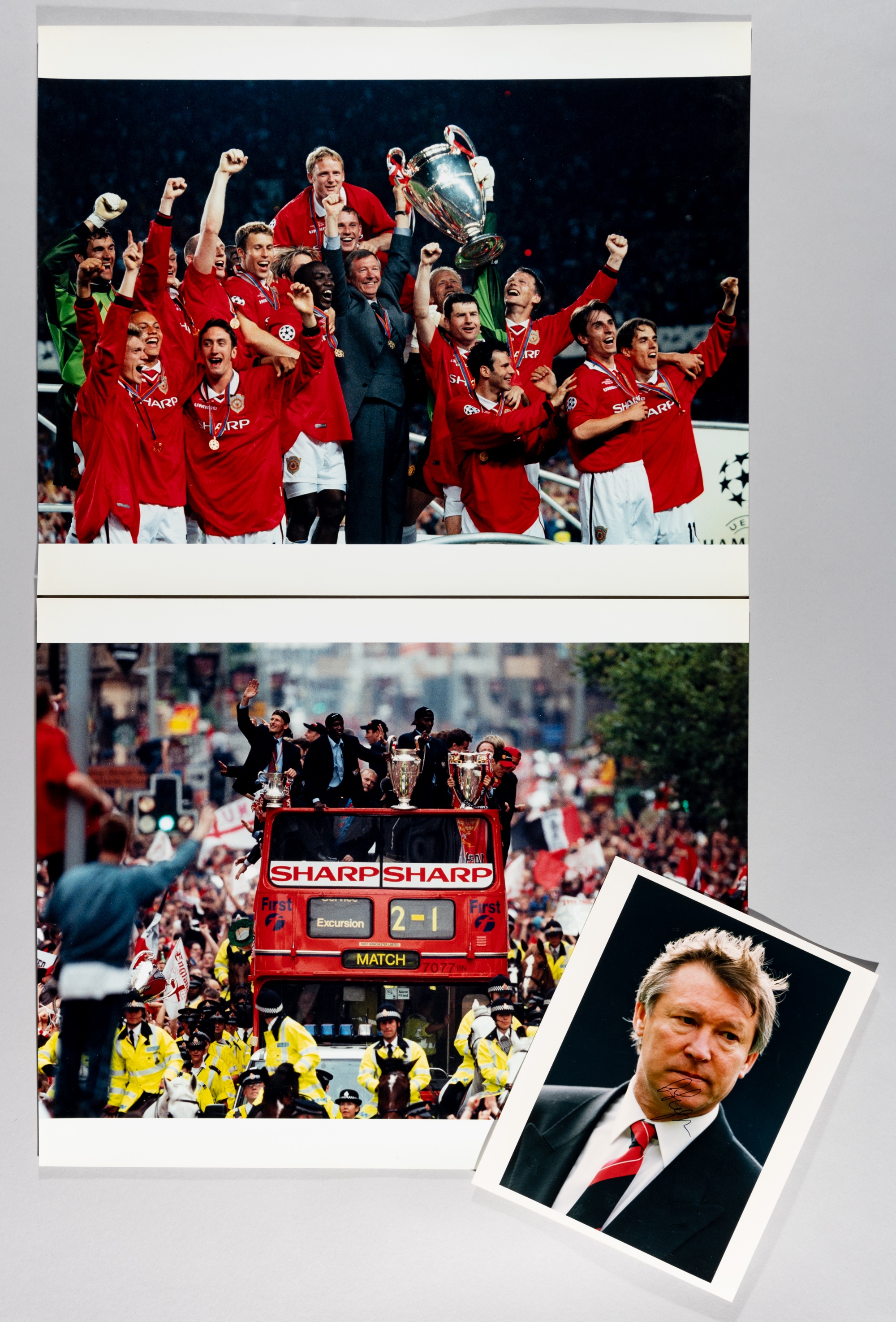 SIR ALEX FERGUSON & MANCHESTER UNITED TREBLE WINNERS 1998-99 AUTOGRAPHED FOOTBALL PHOTOGRAPH OF THE THIRTEEN TIME PREMIER LEAGUE CHAMPIONS MANAGER, PLUS TWO 1998-99 TRBLE WINNERS LARGE PHOTOGRAPHS, Sir Alexander Chapman Ferguson CBE (born 31 December 1941) is a Scottish former football manager and player. He is considered by many to be one of the greatest managers of all time who has won more trophies than any other manager in the history of football. Ferguson was appointed manager of Manchester United in November 1986. During his 26 years with Manchester United he won 38 trophies, including 13 Premier League titles, five FA Cups, and two UEFA Champions League titles. He was knighted in the 1999 Queen’s Birthday Honours list for his services to the game. Ferguson is the longest-serving manager of Manchester United, having overtaken Sir Matt Busby’s record on 19 December 2010. He retired from management at the end of the 2012-13 season, having won the Premier League in his final season. ORIGINAL COLOUR PHOTOGRAPH SIZE 10 by 8in. DEPICTING MANCHETER UNITED MANAGER SIR ALEX FERGUSON IN HEAD AND SHOULDERS POSE. NICELY AUTOGRAPHED IN BLACK PEN TO THE CENTRAL PORTION OF THE IMAGE BY SIR ALEX FERGUSON. VERY GOOD CONDITION. SOLD WITH TWO LARGE 20 by 16in. COLOUR PHOTOGRAPHS DEPICTING THE MANVHESTER UNITED TREBLE WINNERS, ONE WITH THE EUROPEAN CUP, THE OTHER ON THE CELEBRATION BUS WITH ALL THREE TROPHIES. TOTAL OF THREE ITEMS.