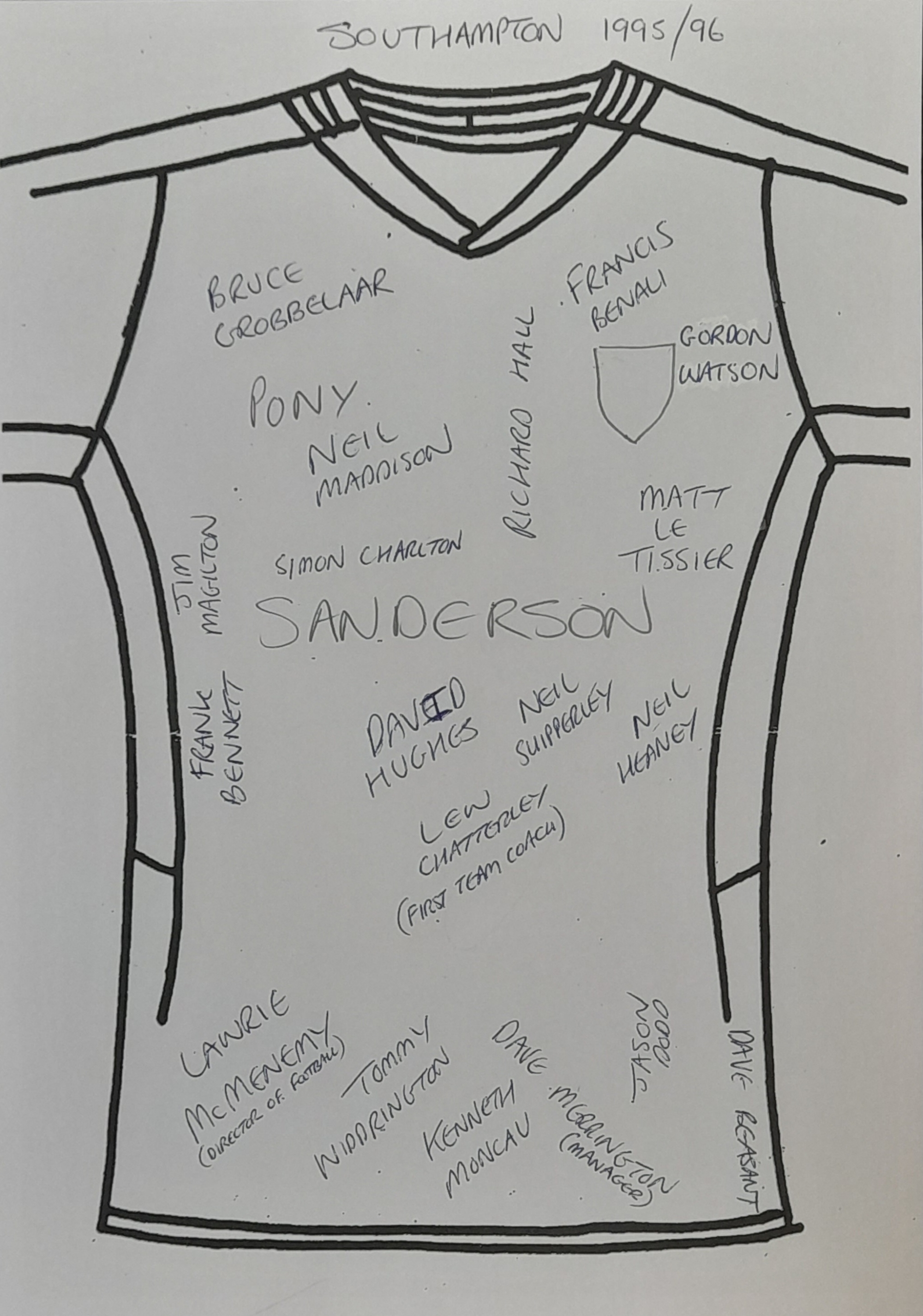 Southampton 1995-96 squad signed shirt, the season they beat Manchester United 3-1 also escaping relegation this season on goal difference. Autographed by 19 as follows, Bruce Grobbelaar, Francis Benali, Gordon Watson, Richard Hall, Neil Maddison, Matt Le Tissier, Jim Magilton, Simon Charlton, Frank Bennett, David Hughes, Neil Shipperley, Neil Heaney, Tommy Widdrington, Kenneth Moncau, Jason Dodd, Dave Beasant, Dave Merrington (manger), Lew Chatterley (1st team coach) and Lawrie McMenemy (director of Football / ex manger), comes with shirt map