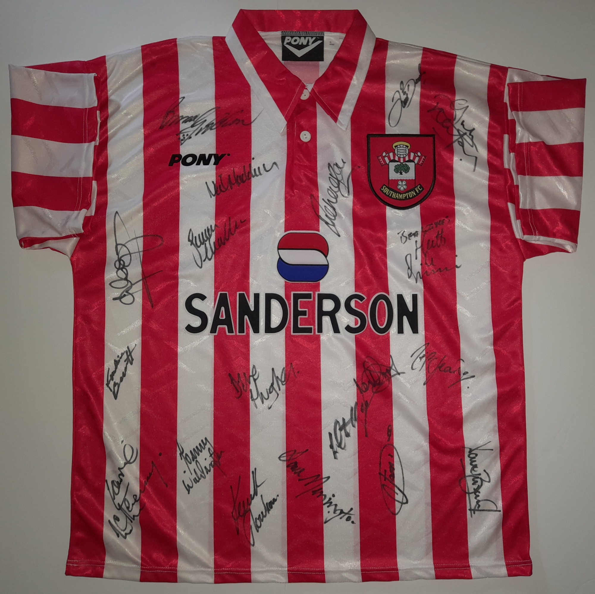 Southampton 1995-96 squad signed shirt, the season they beat Manchester United 3-1 also escaping relegation this season on goal difference. Autograp