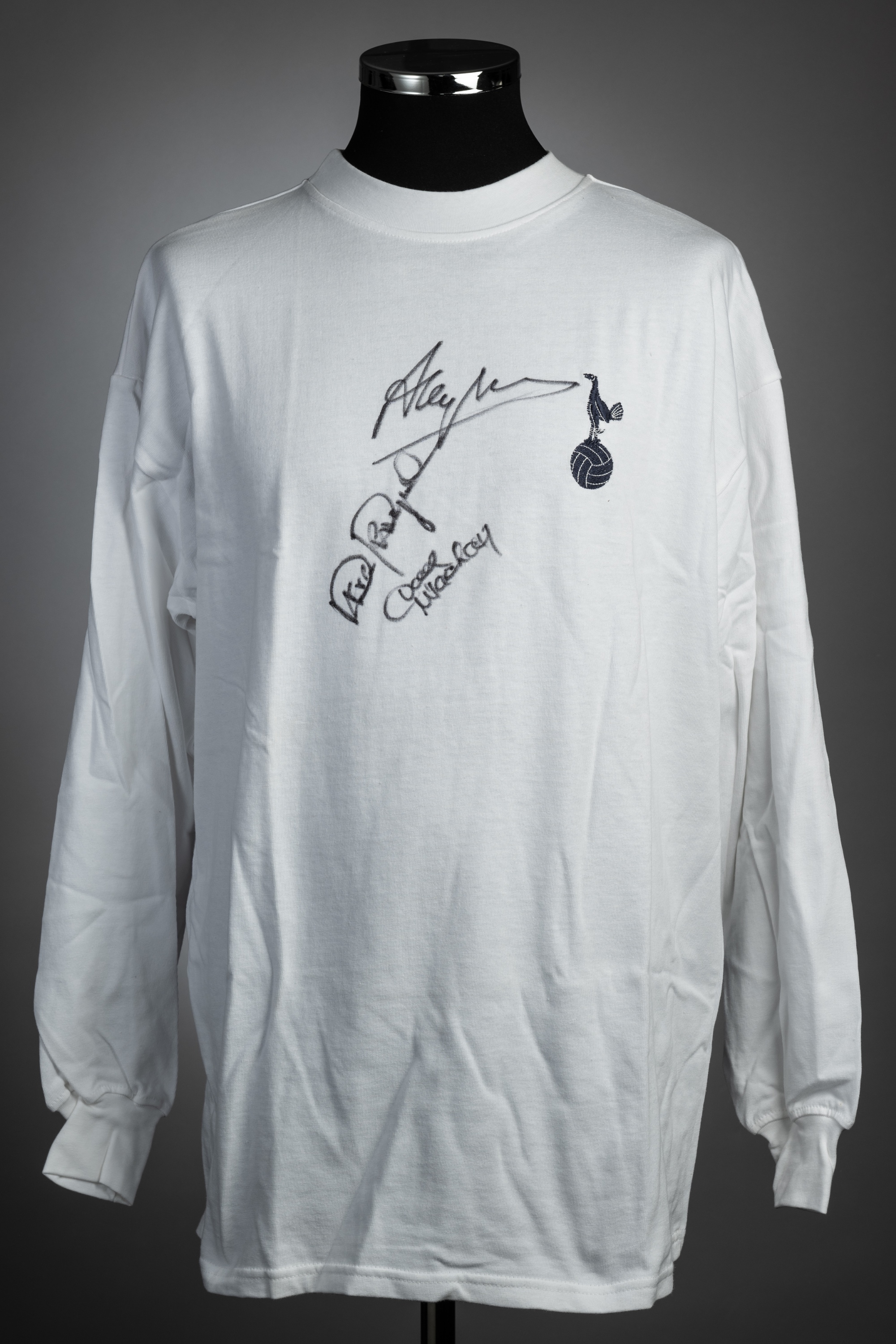 Signed white Tottenham Hotspur retro jersey by three legendary captains Alan Mullery, Steve Perryman & Dave Mackay, Toffs, long-sleeved with embroidered club crest, reverse vacant, size XL, signed in black marker pen on front, with retail tag attached