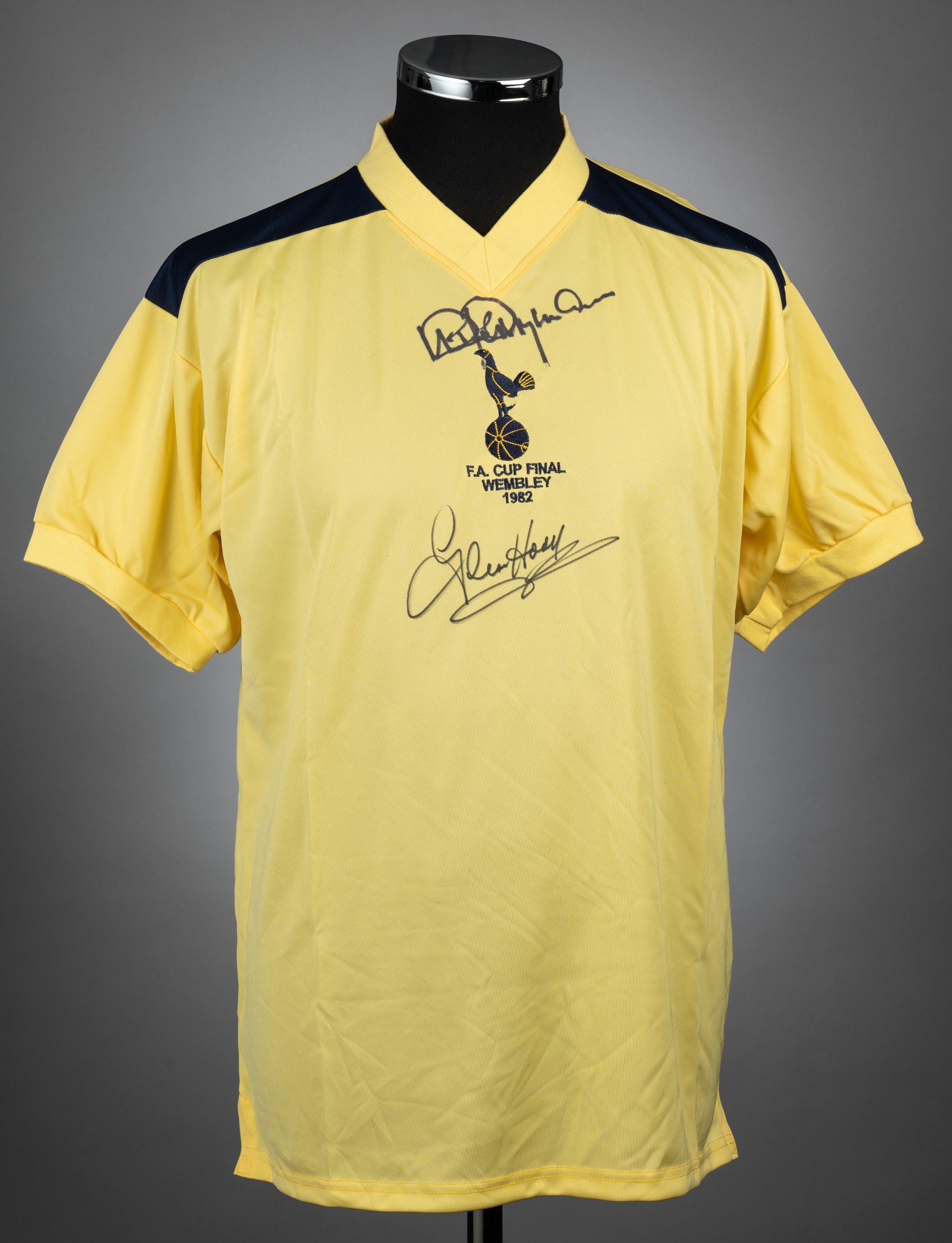 Steve Perryman and Glen Hoddle yellow Tottenham Hotspur FA Cup Final 1982 retro jersey, Score Draw, short-sleeved with club crest and embroidered F.A. CUP FINAL WEMBLEY 1982, signed in black marker pen on front, size M, with retail tag