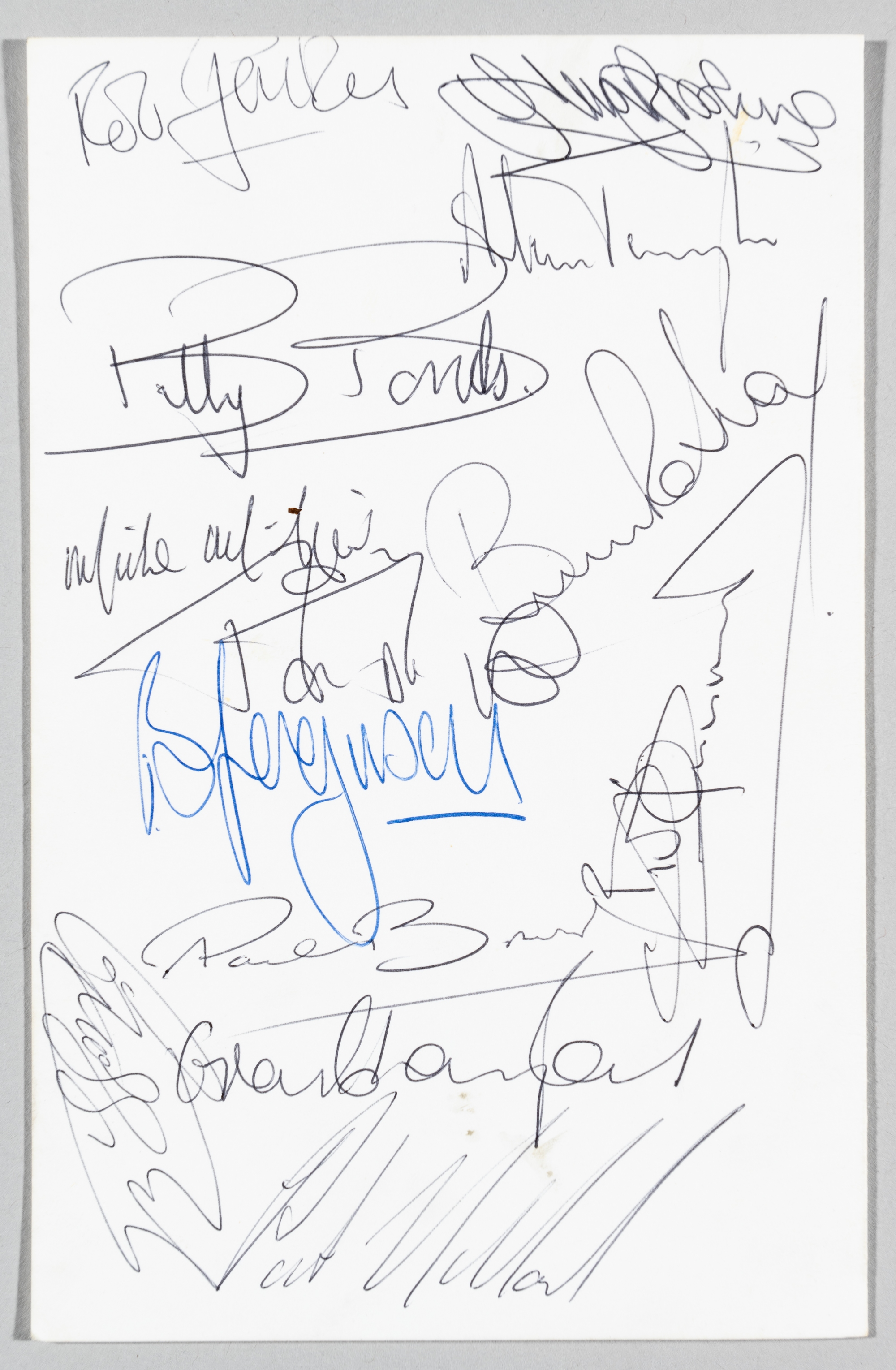 Signed West Ham United dinner dance & cabaret menu, held at Heybridge Moat House, 14th January 1979, signed in blue and black ink on reverse Brooking, Robson, Brush, Lampard, Price, Jennings, McGiven, McDowell, Jenkins, Bonds, Ferguson, Taylor, Holland and others, good condition