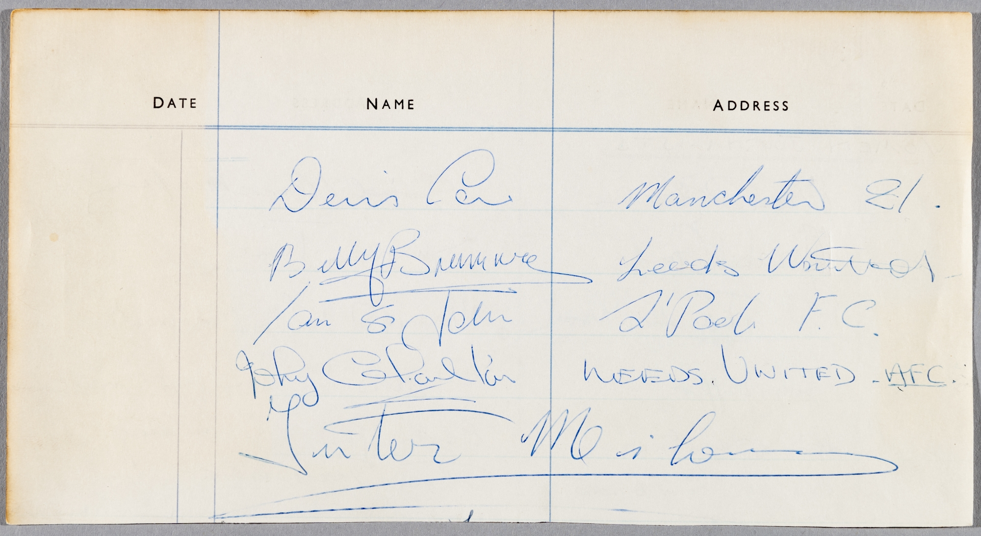Bremner, Charlton, Law, St John & Milburn autographed football visitors book part page, signed by each (with additional team name in own hand by Billy Bremner (Leeds), Ian St John (Liverpool), Jack Charlton (Leeds), Denis Law (Manchester United) plus Jackie Milburn (Newcastle) United.
