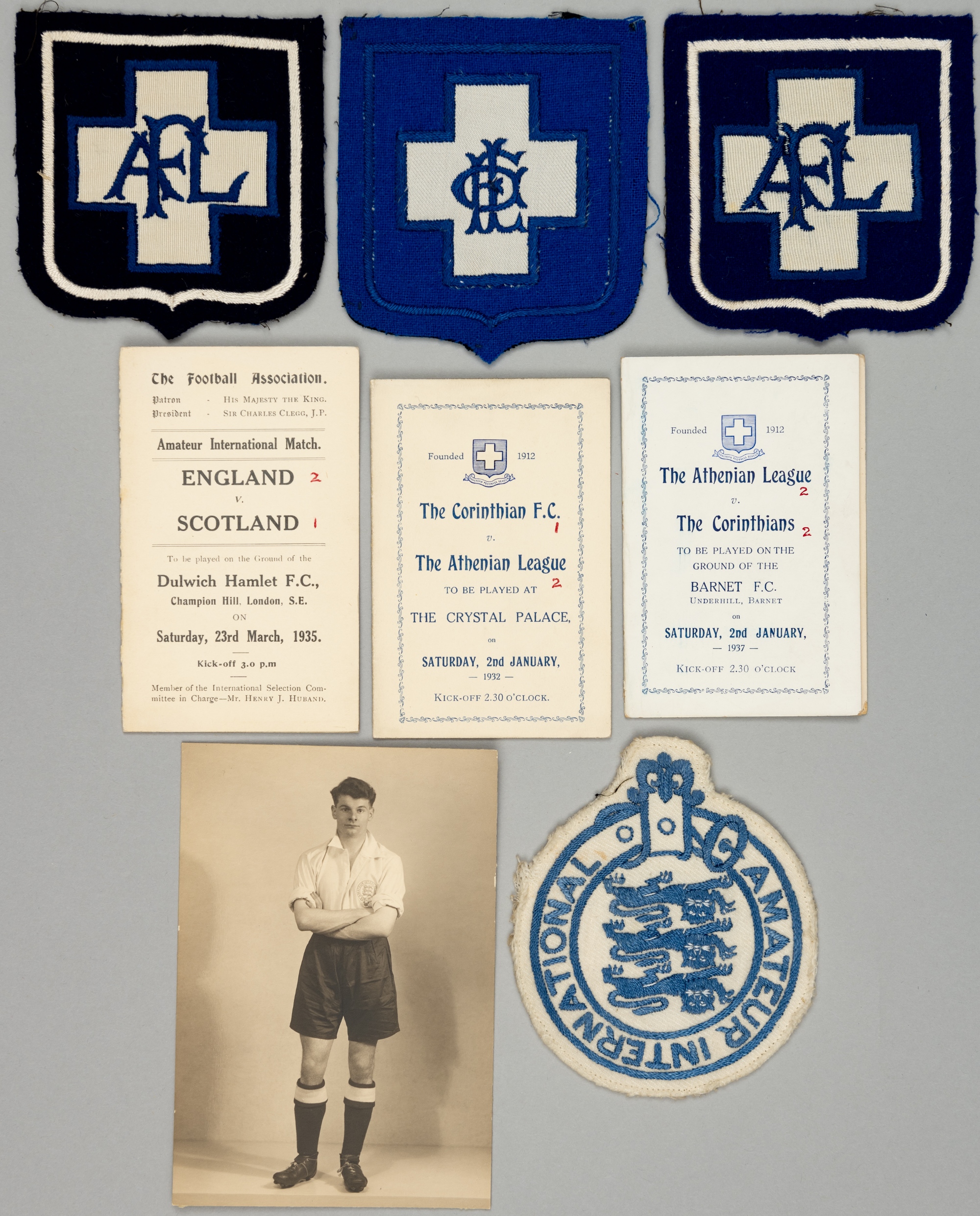 Lester Finch memorabilia, Lester Finch played many games for representative teams especially the American League in which Barnet played, it was normal to present selected players a jersey badge which had the match details to rear. They also received match itinerary card. Collection of 13 badges and corresponding itineraries, covers from 1932-37, includes v RAF 9th November 1932 and tours to Liege 6th February 1935, Antwerp Easter 1935, Brussels Easter 1936; sold with England v Scotland itinerary 23rd March 1935, Amateur International badge and b & w photograph of Finch in England kit, good condition with ink annotations, (29) Lester Finch born 1909-95 was one of the leading amateur players of his period, he played and managed Barnet from 1928-55, making 476 appearances, scoring 226 goals. He also played many times for England Amateur team, touring New Zealand and Australia 1937 and South Africa 1939 with England FA. He won Amateur Cup with Barnet 1945-46 and played one full wartime International v Wales 1941. During war period he guested for Tottenham Hotspur, Arsenal and Chelsea. One of the last breed of truly amateur players.