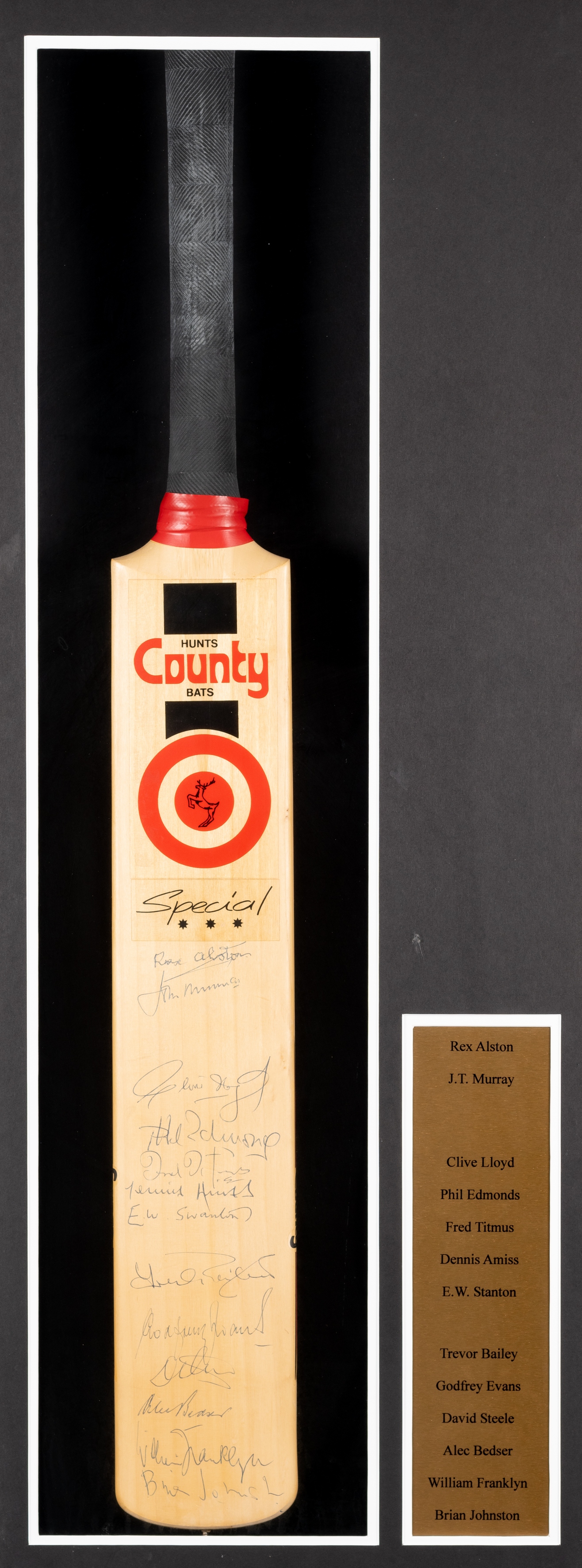 A signed cricket bat formerly owned by the broadcasting legend Brian 'Johnners' Johnston and on display at his flat overlooking Lord's Cricket Ground, signed in pen by a selection of Johnston's favourite cricketers, comprising Alston, Murray, Lloyd, Edmonds, Titmus, Amiss, Swanton, Bailey, Evans, Steele and Bedser, plus William Franklyn (actor) and Brian Johnston himself, mounted in a frame beside a signature key, glazed and framed, overall 96 by 42cm., sold with documents relating to the charity dinner, (qty) Provenance: purchased by the present seller at The 'Johnners' club annual dinner celebrating 50 years of Test Match Special, 25ht October 2007 in the Long Room at Lords Cricket Ground.