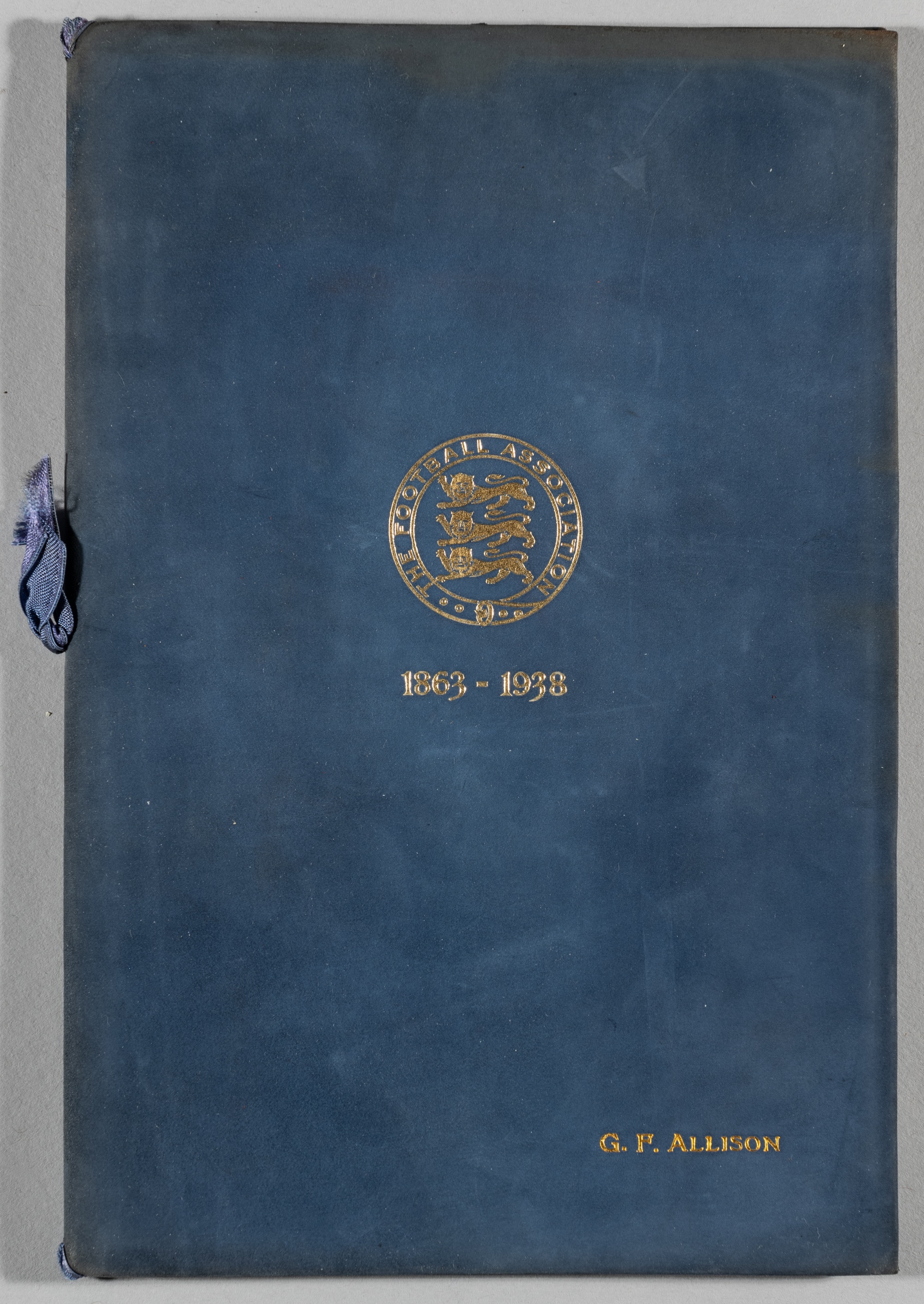 Football Association 75th Anniversary Banquet event programme issued to the Arsenal manager George Allison, held at The King's Hall, Holborn Restaurant, London, 26th October 1938, held in blue suede covers stamped gilt, named to G.F. ALLISON, very good