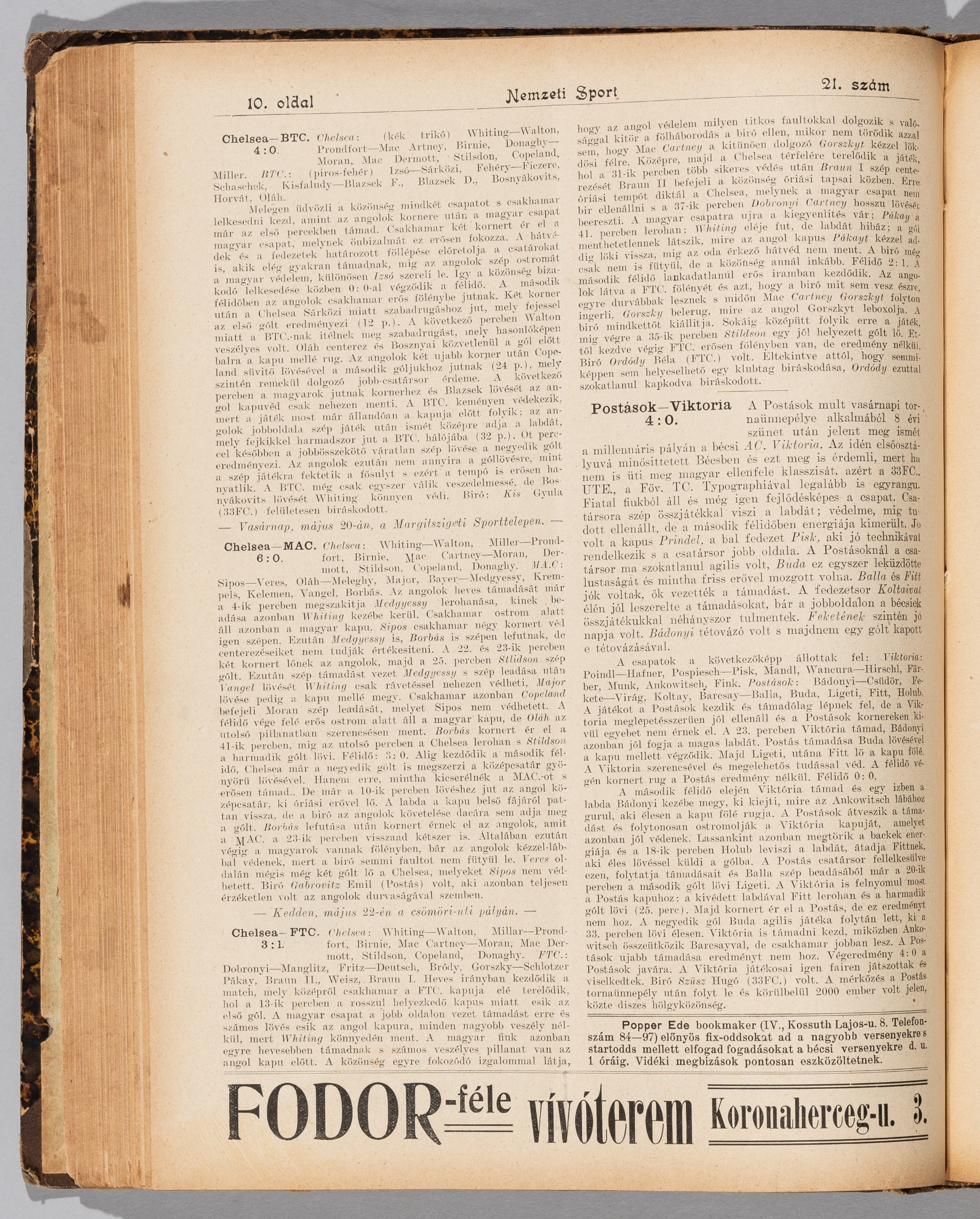 Bound volume of the Hungarian publication 'Nemzeti Sport' featuring Chelsea's end of first season European tour to Hungary, May 1906, the bound volume dated from 7th January to 20th December 1906, featuring comprehensive previews with some team line-ups and match reports of the post-season tour to Hungary of Chelsea, Southampton, Celtic, Newcastle United and others, including Chelsea team line-ups with previews and results of their matches in Budapest, text in Hungarian, bound in hardcover, bears wear and damage to spine and hardcover, internal pages slightly discoloured due to age This European Tour consisted of Denmark, Bohemia, Hungary and Austria, just one year after formation, winning each match. Chelsea played three matches in Budapest v Budapesti Torna Club (BTC) and won 4-0; v Maygar Atletikai Club (MAC) and won 6-0 and v Ferencvaros Terna Club (FTC) and won 3-1.