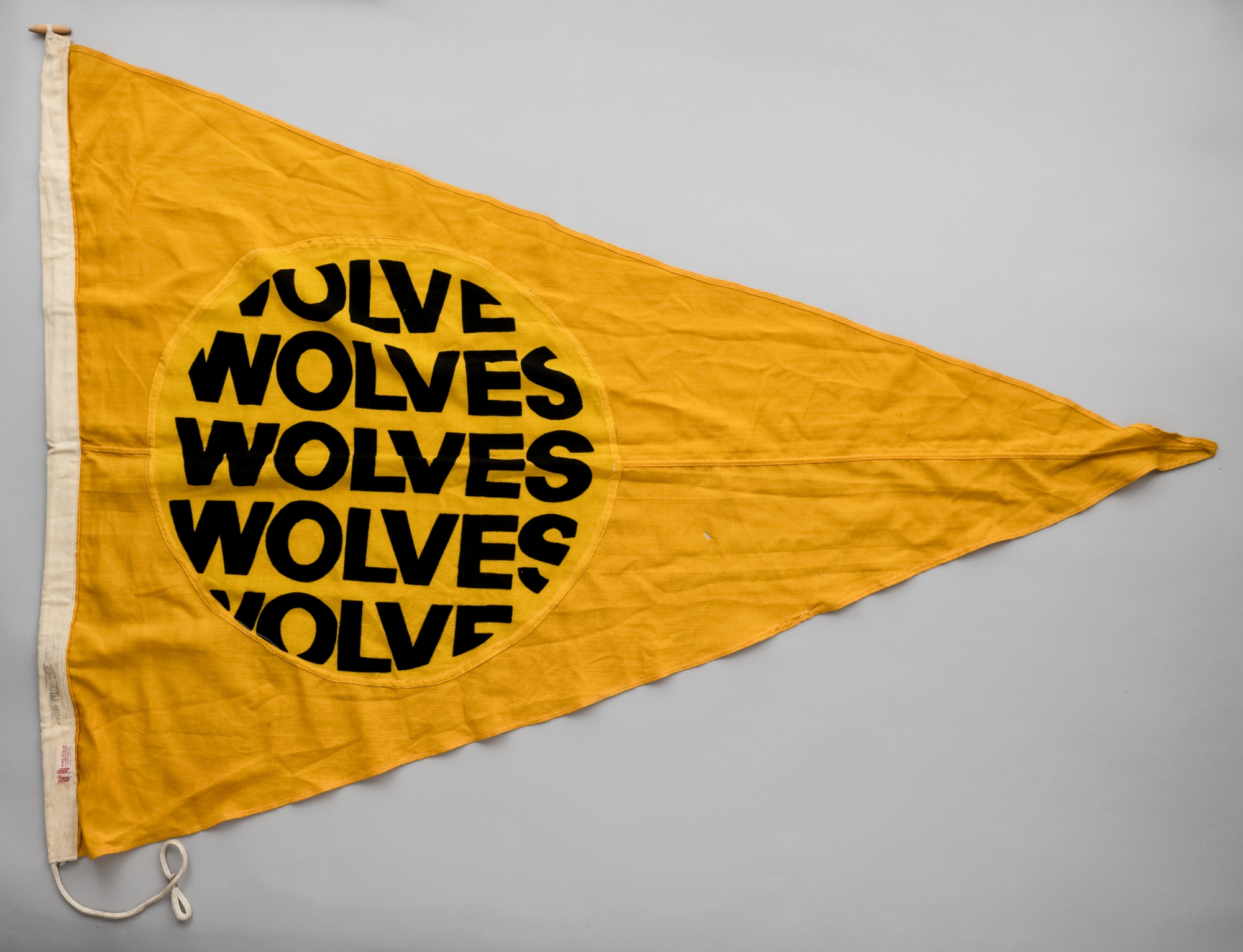 Wolverhampton Wanderers Molineux football ground flag circa early 1980s, by George Tutill, yellow wool and nylon triangular flag with cream seam, wooden toggle and rope, black printed lettering WOLVES, 104 by 150cm. approx., bears markers label