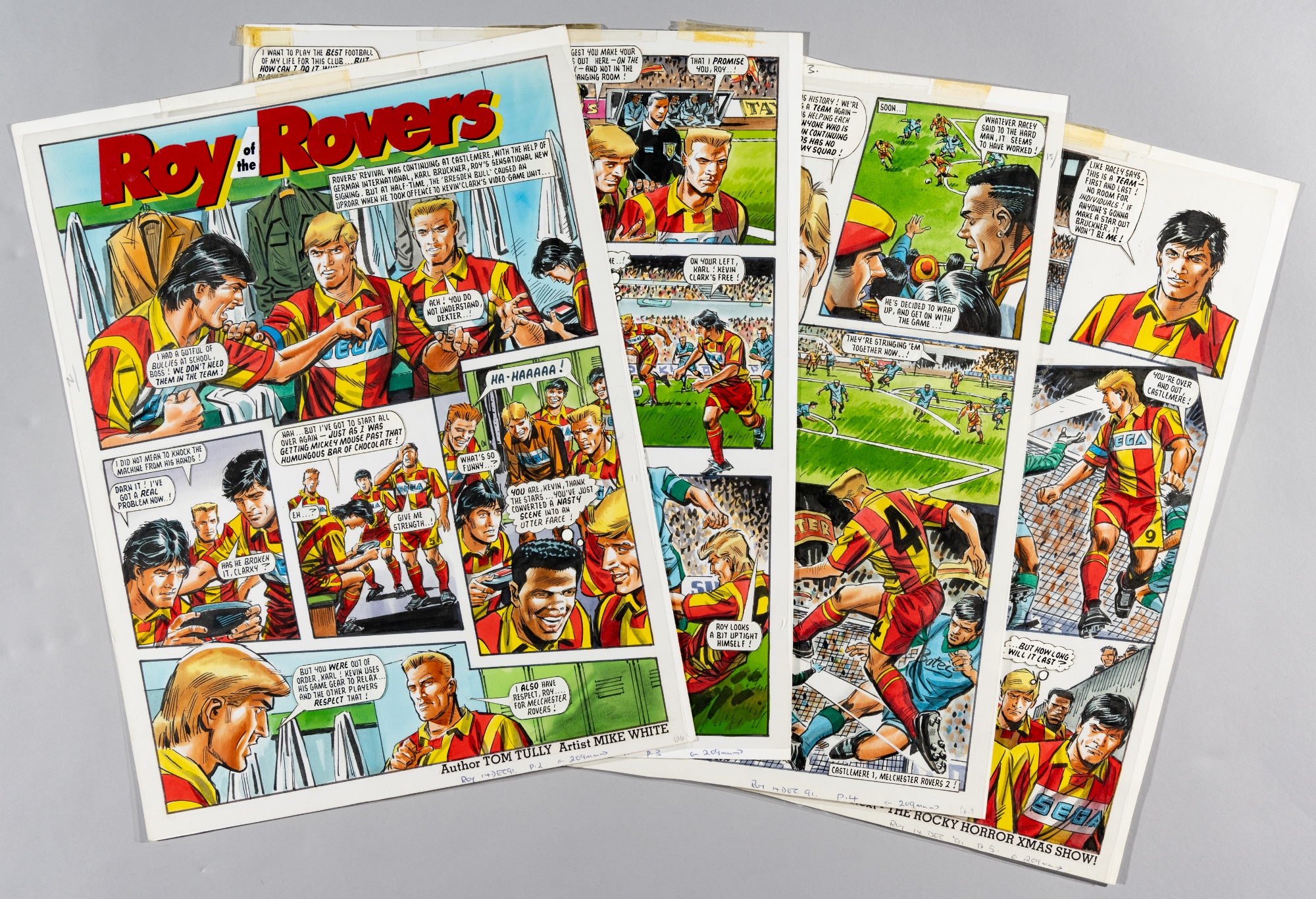 FOOTBALL: ROY OF THE ROVERS COMPLETE 4 PANEL STORYLINE FOR THE ISSUE PUBLISHED ON THE 14th OF DECEMBER 1991. FOUR FULL SIZE ORIGINAL 17 ½ by 13 ½ in. WATERCOLOUR AND GOUACHE PAINTED PANELS BY THE ARTIST MIKE WHITE, EACH WITH STORY CELL OVERLAY WRITTEN BY THE AUTHOR TOM TULLY.