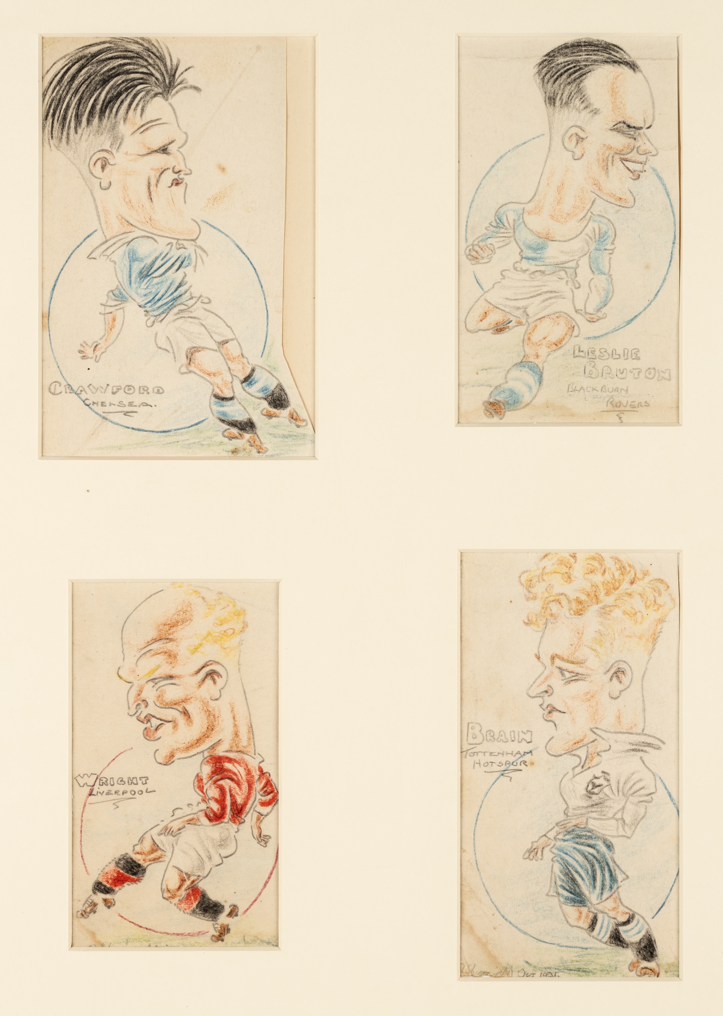 Six original caricatures of legendary footballers, circa 1930s, comprising a pencil and crayon caricature of Blackburn Rovers' Willie Rankin by Shinwell, signed lower right margin, mounted, glazed and framed, overall 46 by 39cm.; a pencil and crayon caricature of six footballers including West Ham United's VI Gibbins, Port Vale's Littlewood, Chester's Jennings, Reading's Bacon, Corinthians AG Doggart and Mansfield Town's Harry Johnson, all individually drawn on one sheet, signed indistinctively lower right margin, mounted, glazed and framed, overall 45 by 39cm.; four pencil and crayon caricatures of four footballers by Shinwell, all on individual cut pages, including Chelsea's Crawford, Blackburn Rover's Leslie Bruton, Liverpool's wright and Tottenham Hotspur's Brain, mounted, glazed and framed, overall 48 by 38cm., (3 frames) Please be aware all glass will be removed from framed and glazed items prior to posting and may result in delays to shipping your items. (This service is included in the cost of postage and packing). We can also totally remove all framing and mounts upon request to reduce shipping costs. Alternatively lots can be collected in person by prior appointment from NN8 1RT.