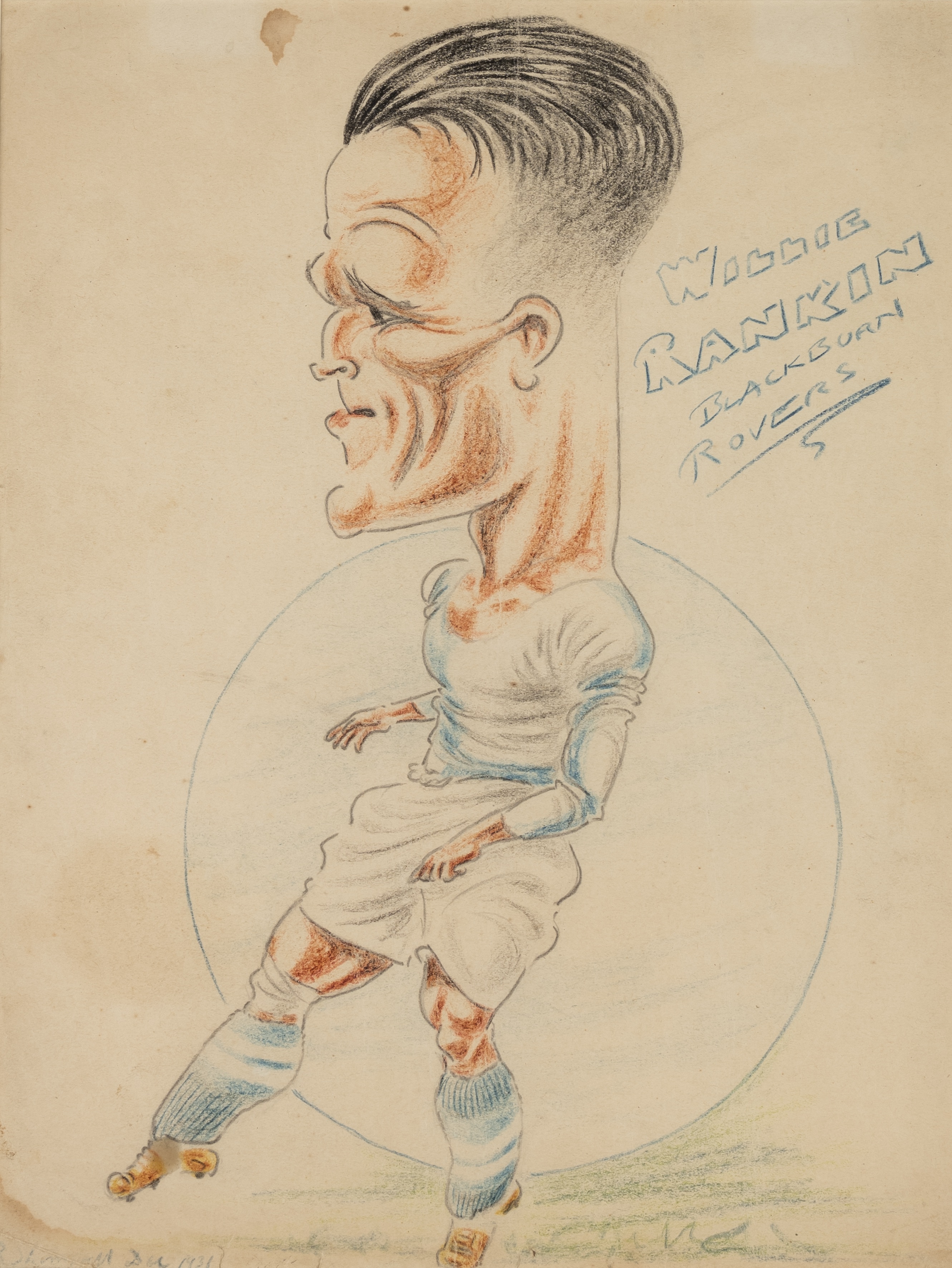 Six original caricatures of legendary footballers, circa 1930s, comprising a pencil and crayon caricature of Blackburn Rovers' Willie Rankin by Shinw