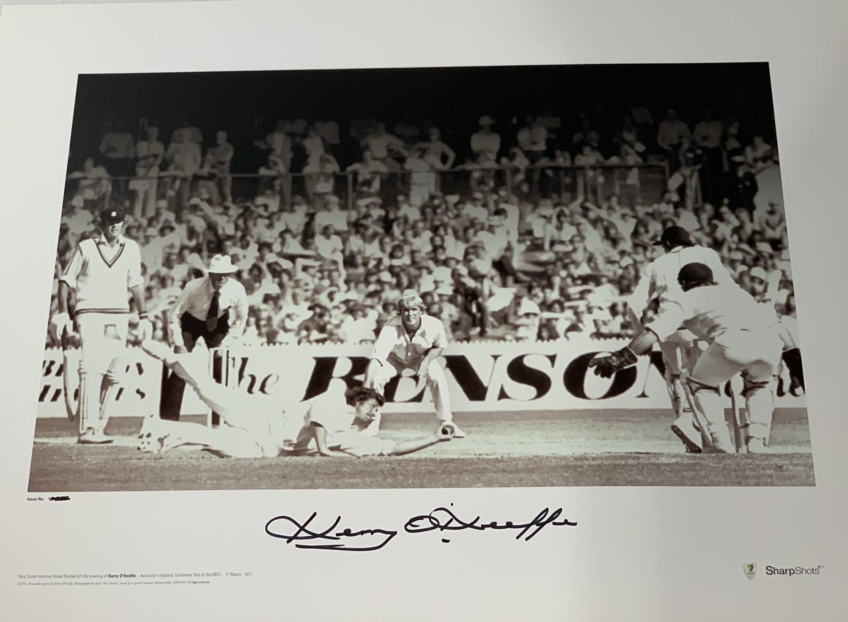 Australia: Kerry O’Keefe signed limited edition black and white print from 1977 Centenary Test Match at MCG (Australia v England), produced by Sharp Shots and officially licensed/endorsed by Cricket Australia. Features Kerry O’Keefe bowling, Rod Marsh wicketkeeping with Gary Cosier catching out Derek Randall of England. 17/03/1977. Size of print: 60 by 45cm., comes with COA.