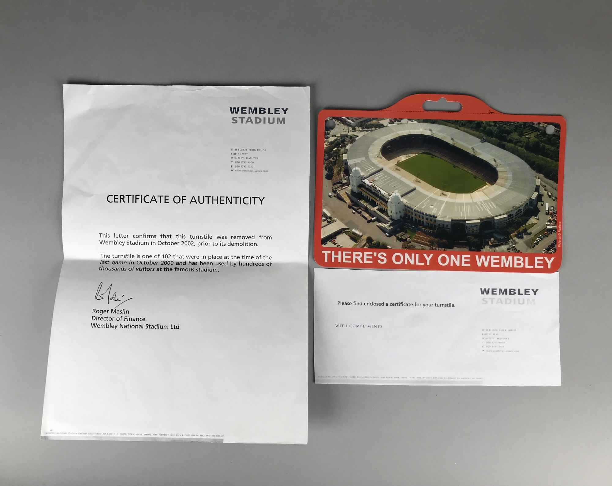 Wembley white cast iron turnstile from the fan's entrance to the ground by W.I. Ellison & Co. Manchester, acquired from the 'Great Wembley Sell-off' prior to the construction of the current Wembley Stadium, the demi-lune structure with knopped upright supports bearing makers embossed stamp, pedal operated with four turnstile sections, fair with wear throughout, obvious rust and paint peeling, crack in part of cast iron base, height 104cm., width 108cm., depth 97cm., approximately, sold with original 2002 COA from Wembley Stadium; sold with The Mail on Sunday newspaper article dated 9th February 2003, faded and yellowed. Collection Only. The Wembley Stadium COA confirms that there were a total of 102 turnstiles in operation for the last match and prior to the demolition project.