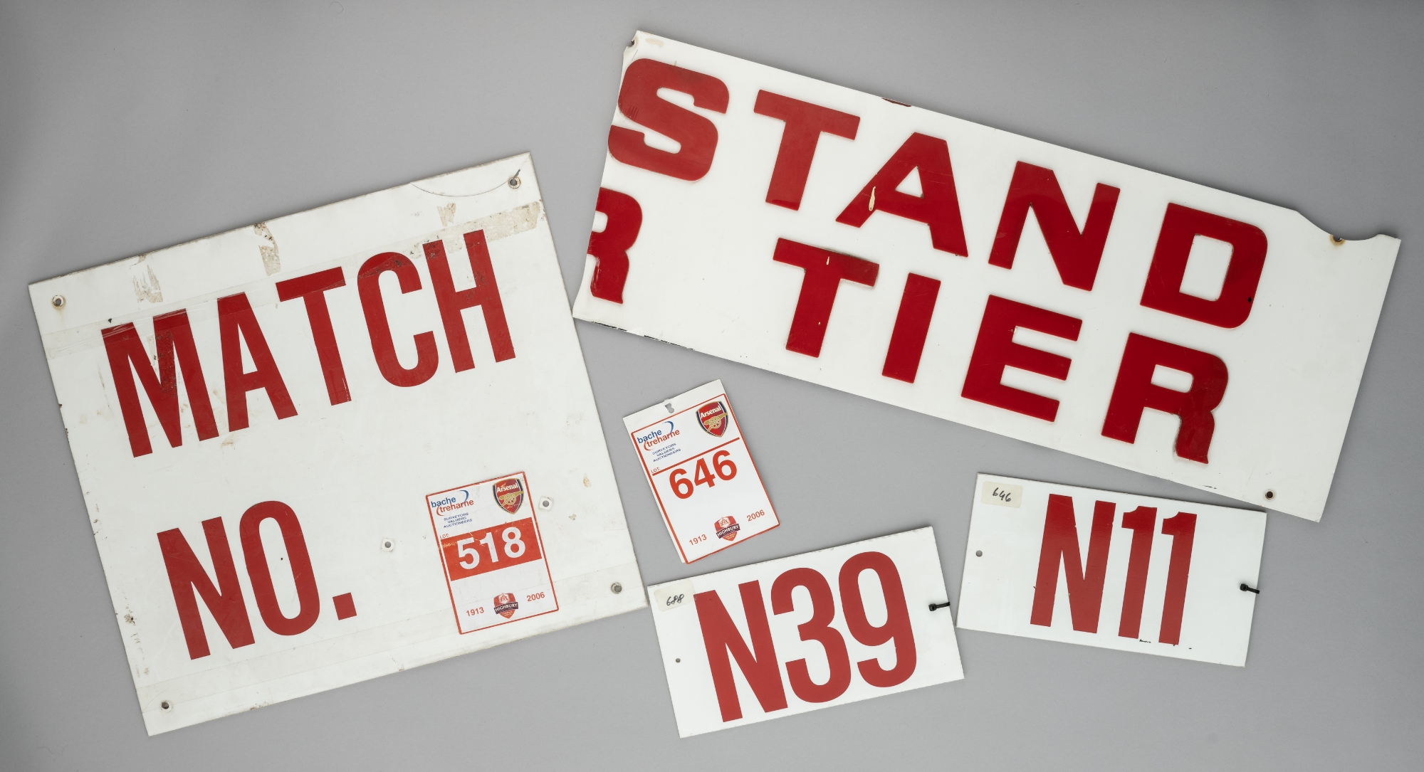 Four sections of signage acquired at Arsenal FC's "Highbury, The Final Salute" auction in 2006, acrylic, red lettering on white background, i) MATCH No., 45 by 50cm., ii) STAND, TIER, 29 by 75cm. iii) N11, 15 by 28cm. and iv) N39, 15 by 28cm., all in condition as originally salvaged