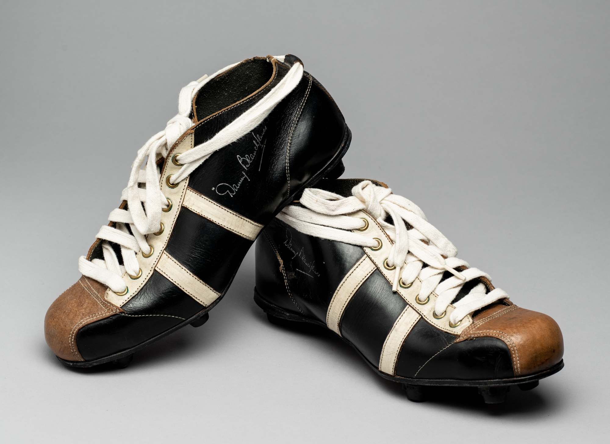 DANNY BLANCHFLOWER player-endorsed vintage football boots circa late 1950s, these appear to be worn, though judging by the clean leather soles they h