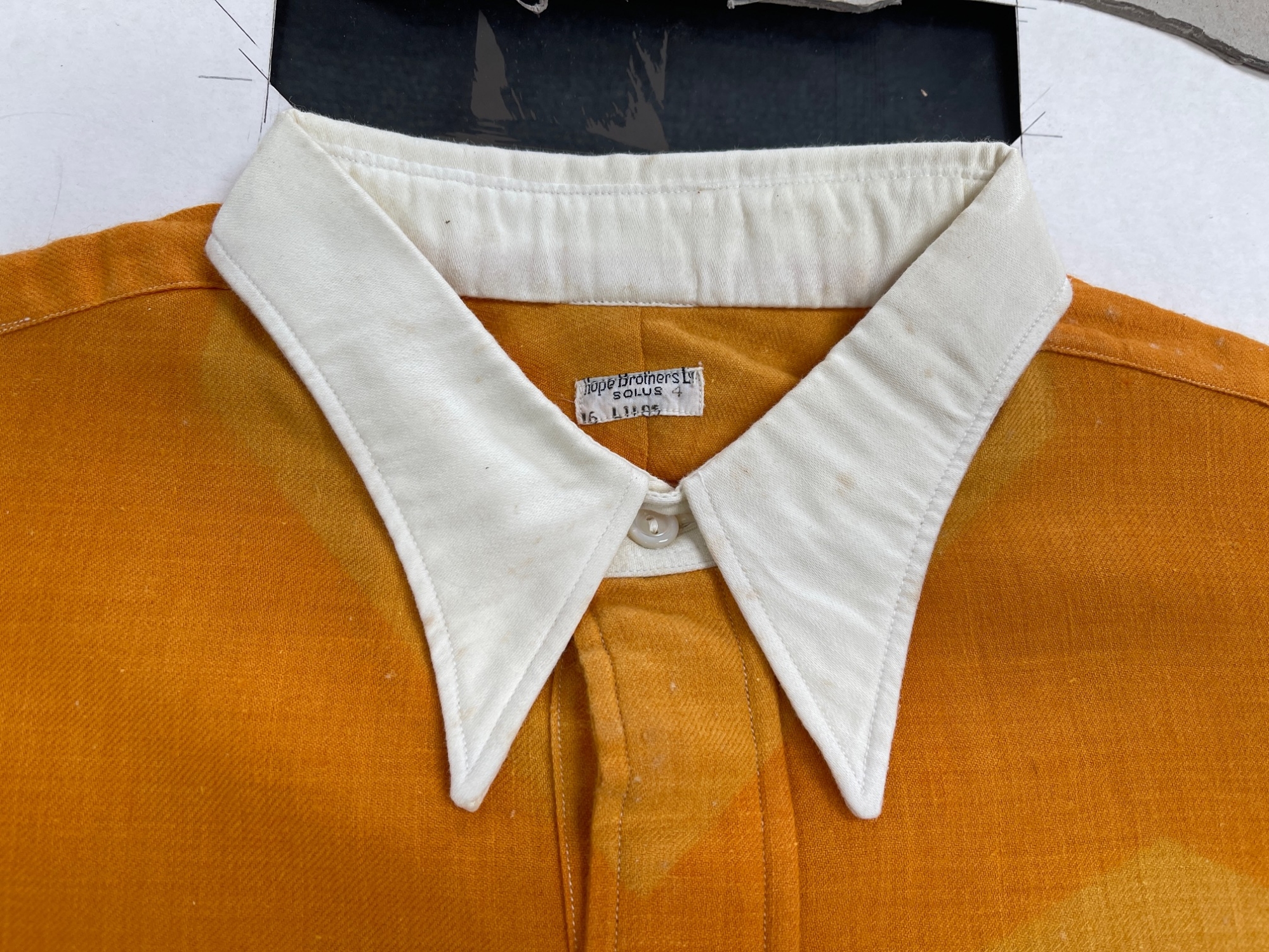 Alex Forbes yellow Arsenal No.4 1950 F.A. Cup Final jersey, Hope Brothers Ltd, with white collar and bearing felt hexagonal chest badge embroidered w