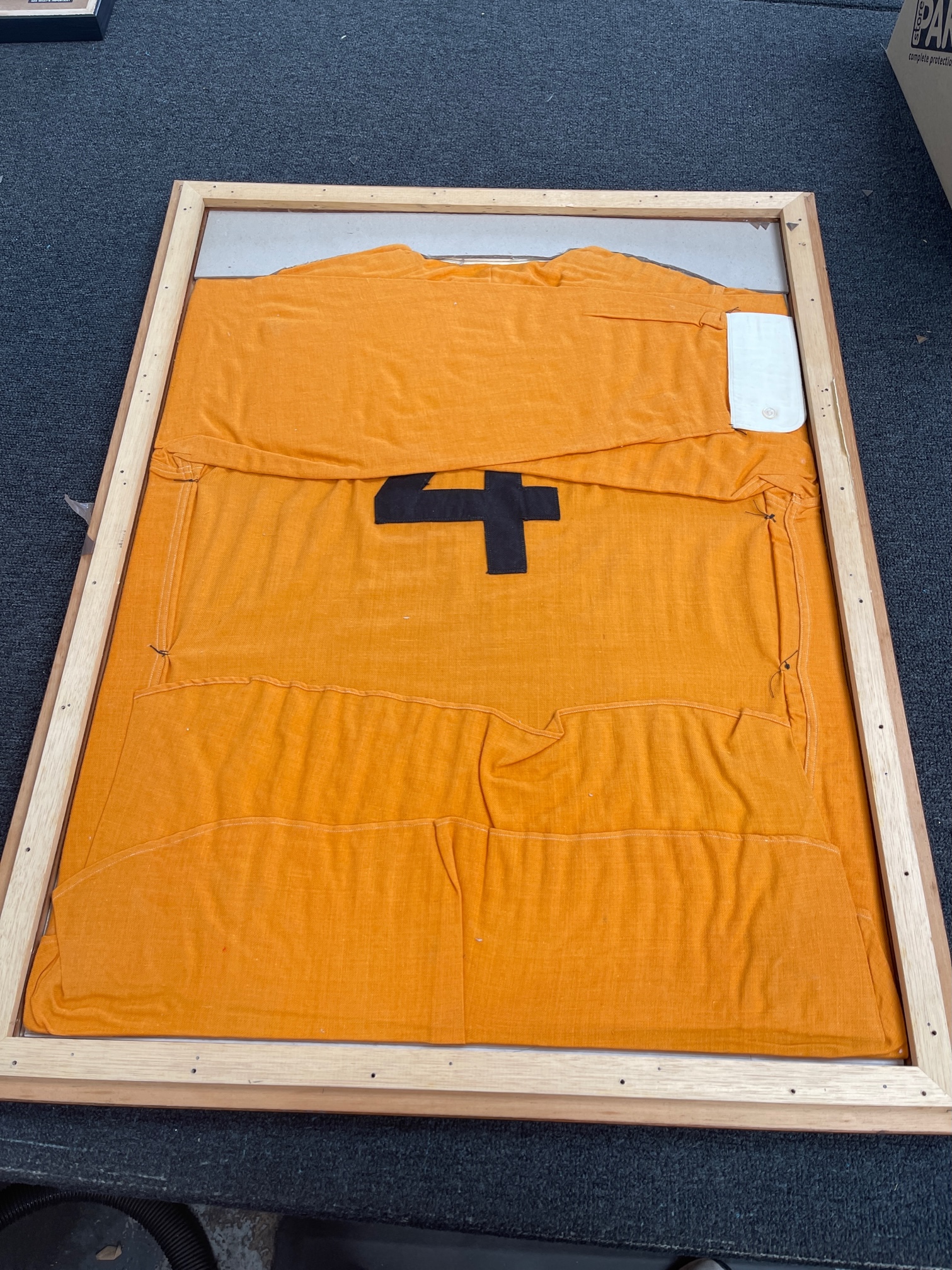 Alex Forbes yellow Arsenal No.4 1950 F.A. Cup Final jersey, Hope Brothers Ltd, with white collar and bearing felt hexagonal chest badge embroidered with AC ENTWINED and 1949-50, mounted behind a mount board with three b & w images of the Arsenal team of the period and one of Alex Forbes, framed and glazed, 80 by 61cm., condition unknown as framed, would need to dismount to view the jersey condition Arsenal beat Liverpool 2-0 in the 1950 F.A. Cup Final through a brace of goals scored by Reg Lewis. Both teams wore change jerseys, Liverpool playing in white and Arsenal in yellow. Scottish international right-half Alex Forbes joined Arsenal in March 1948 from Sheffield United. He made 240 League appearances for The Gunners and was a member of two Championship winning teams. He played 14 times for Scotland and one of his international caps is offered elsewhere in this auction as lot 279.