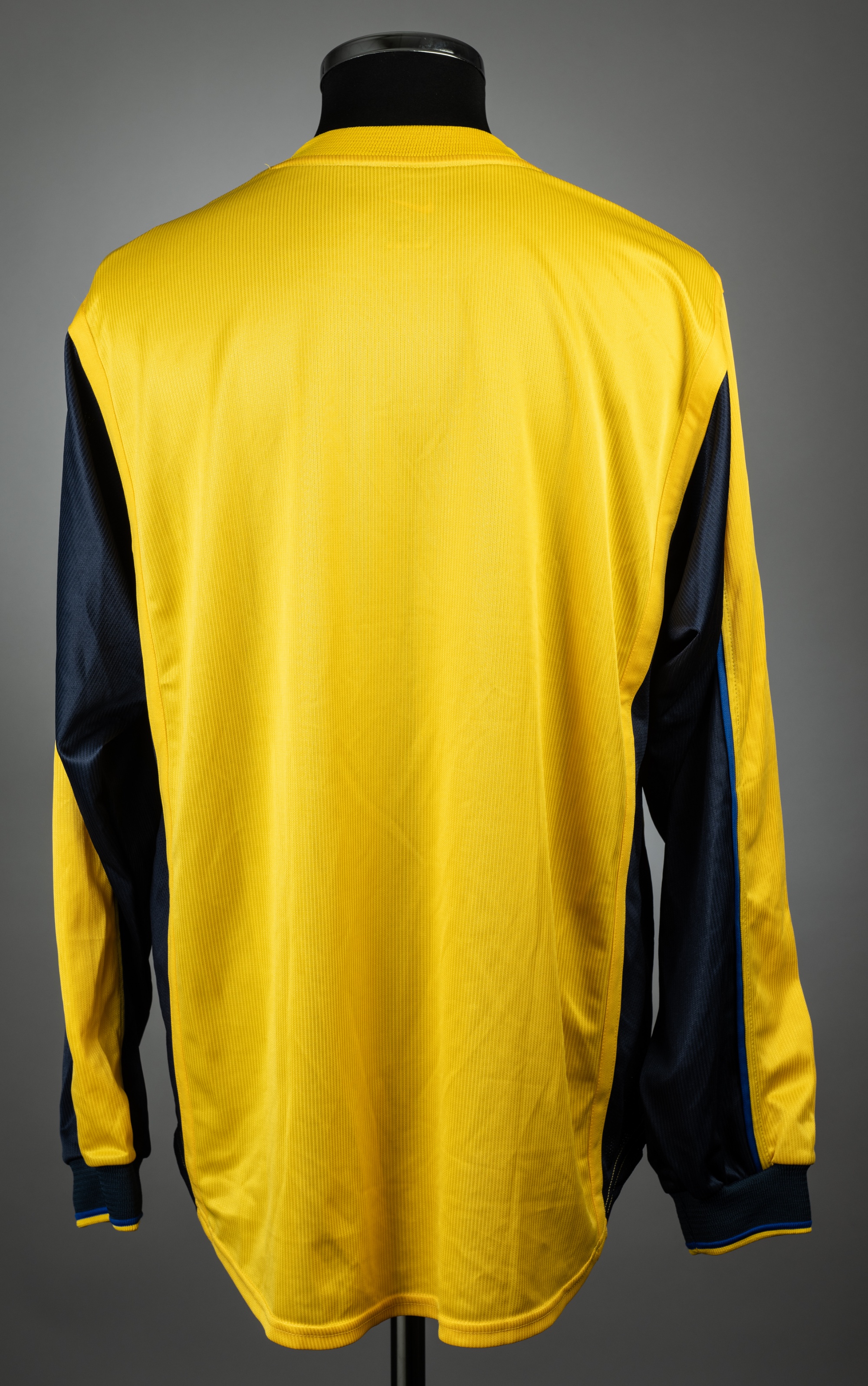 Yellow and navy Arsenal UEFA Cup Final un-numbered jersey v Galatasaray, played at Parken Stadium, 17th May 2000, match issue, Nike, long-sleeved with No sleeve badges, club crest, sponsor logo and embroidered UEFA CUP FINAL MAY 2000, size XL Arsenal were defeated 4-1 on penalties.