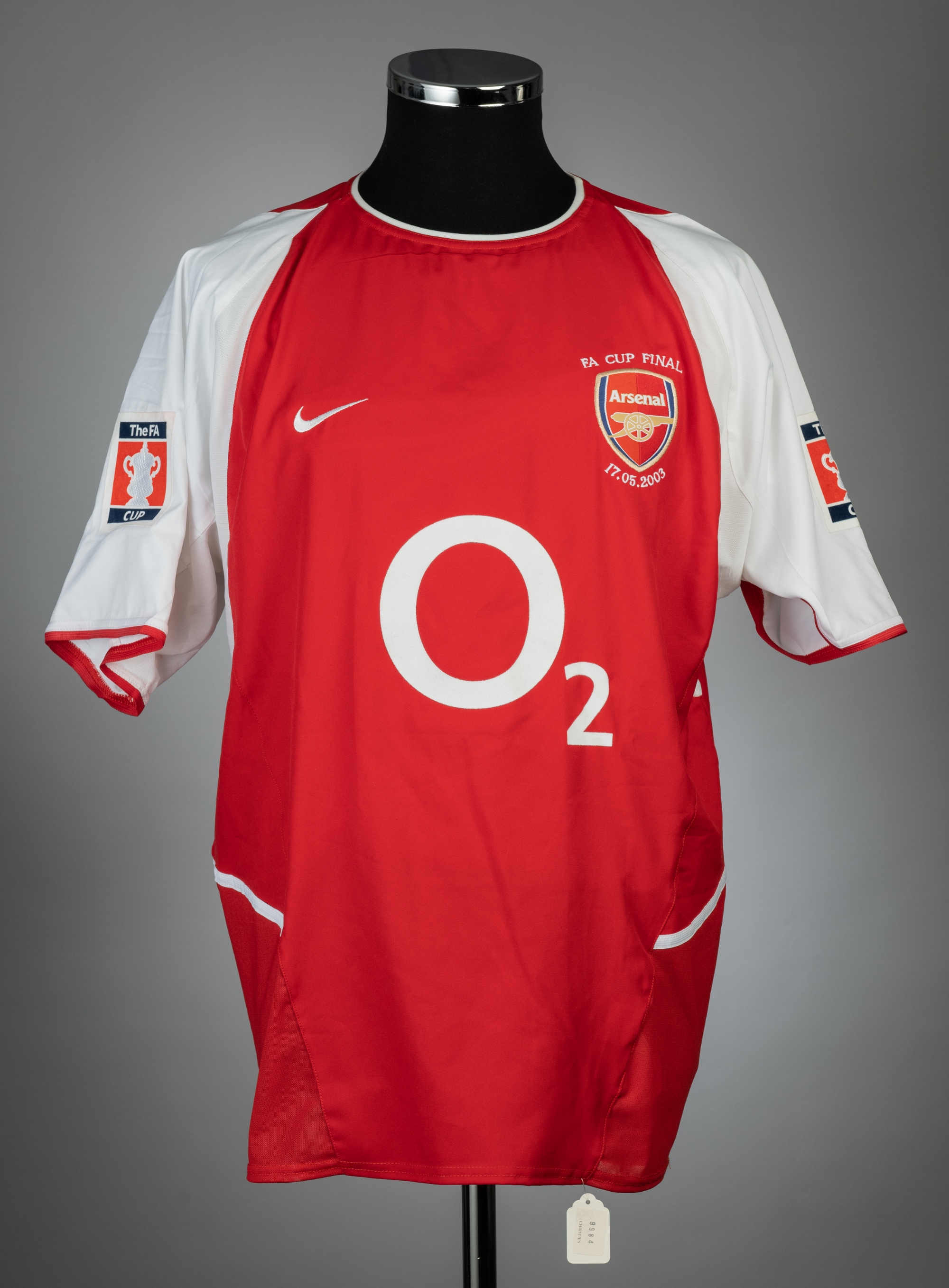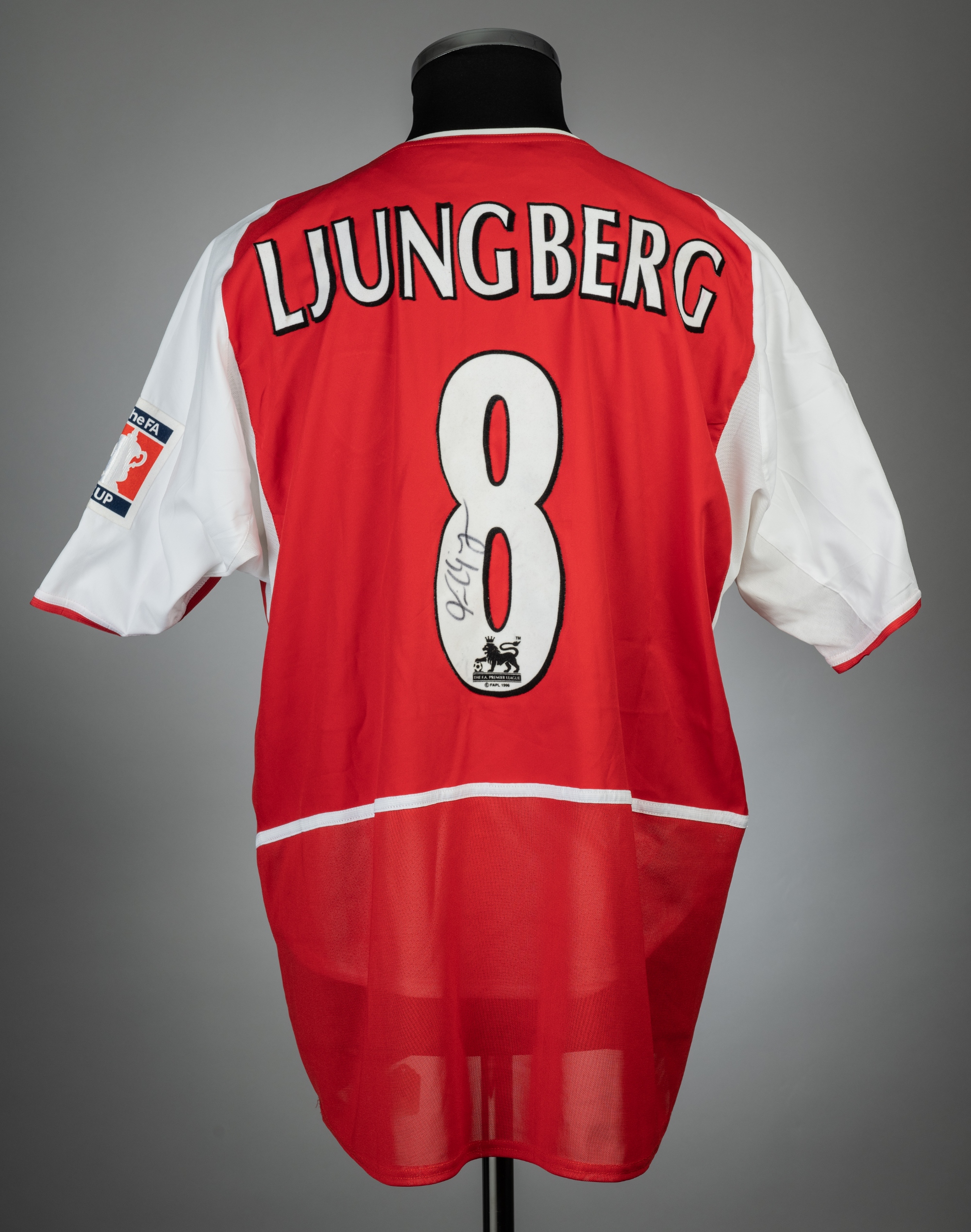Freddie Ljungberg signed red & white Arsenal F.A. Cup Final no.8 jersey v Southampton, played at Millennium Stadium, 17th May 2003, match issue, Nike, shot-sleeved with THE FA CUP sleeve badges, embroidered FA CUP FINAL 17.05.2003, club crest and sponsor logo, reverse lettered LJUNGBERG, size L, signed in black marker pen on number eight on reverse, bears Christies lot tag, bears some wear to number on reverse Provenance: Christies Auction, Lot 85, 24th March 2004 Arsenal defeated Southampton 1-0.