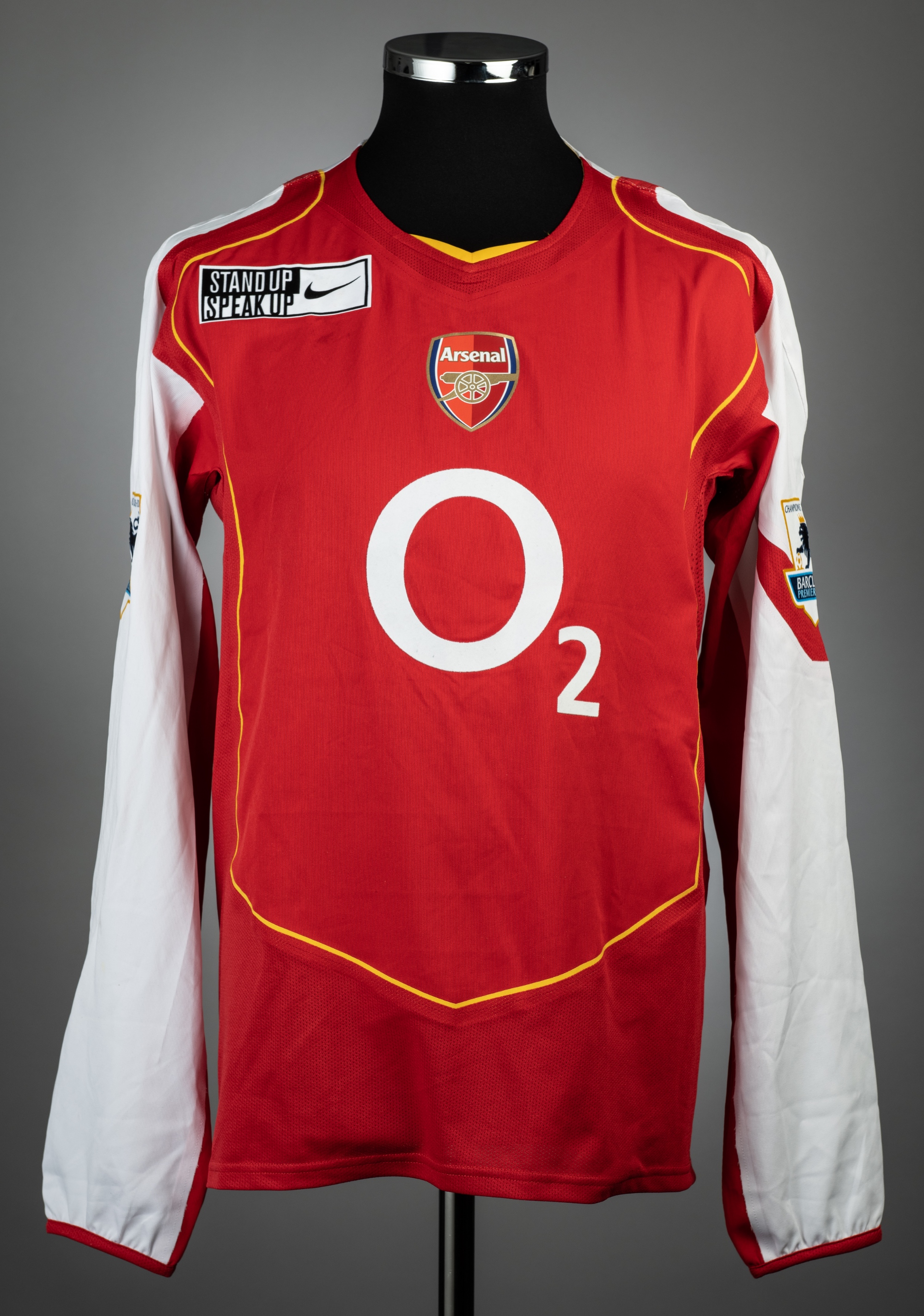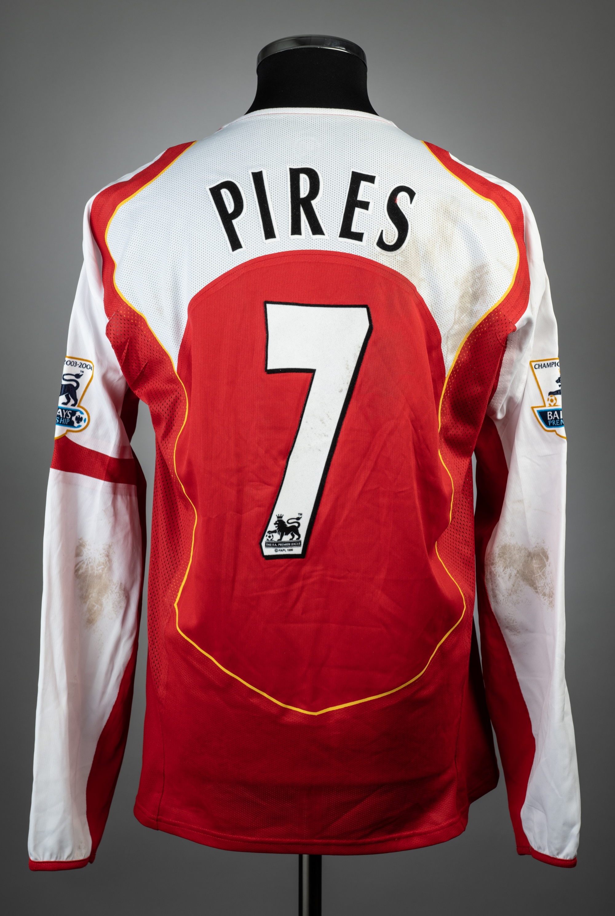 Robert Pires red and white Arsenal no.7 jersey from the infamous Keane v Vieira tunnel incident match v Manchester United, played at Highbury, 1st February 2005, Nike, long-sleeved with BARCLAYS PREMIER SHIP CHAMPIONS 2003-2004 sleeve badges, STAND UP SPEAK UP badge, club crest and sponsor logo, reverse lettered PIRES, size L, bears pitch marks on reverse, has been washed Manchester United defeated Arsenal 4-2, this fixture was famous due to the tunnel bust up between Patrick Vieira and Roy Keane.