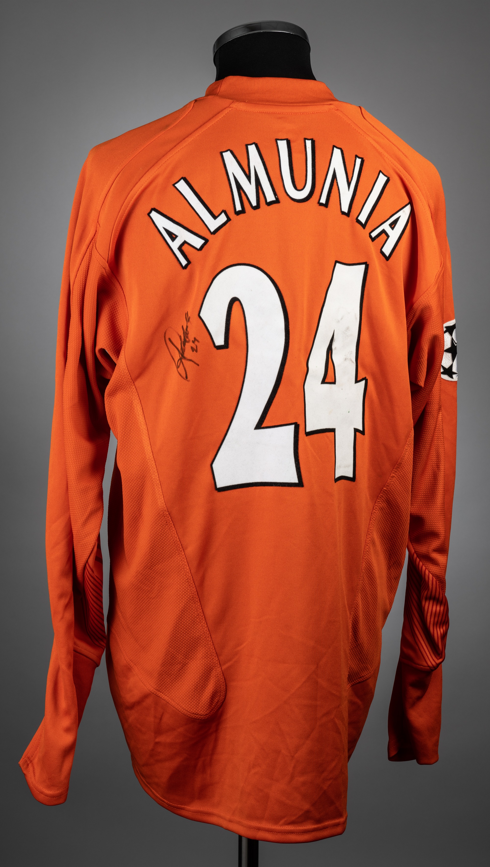 Manuel Almunia signed orange Arsenal UEFA Champions League no.24 goalkeeping jersey v FC Thuno, played at Stade de Suisse, 22nd November 2005, match issue, Nike, long-sleeved with UEFA STARBALL sleeve badge, club crest and sponsor logo, reverse lettered ALMUNIA, size XL, signed in black marker pen on reverse, bears pitch marks to reverse Arsenal defeated FC Thuno 1-0.