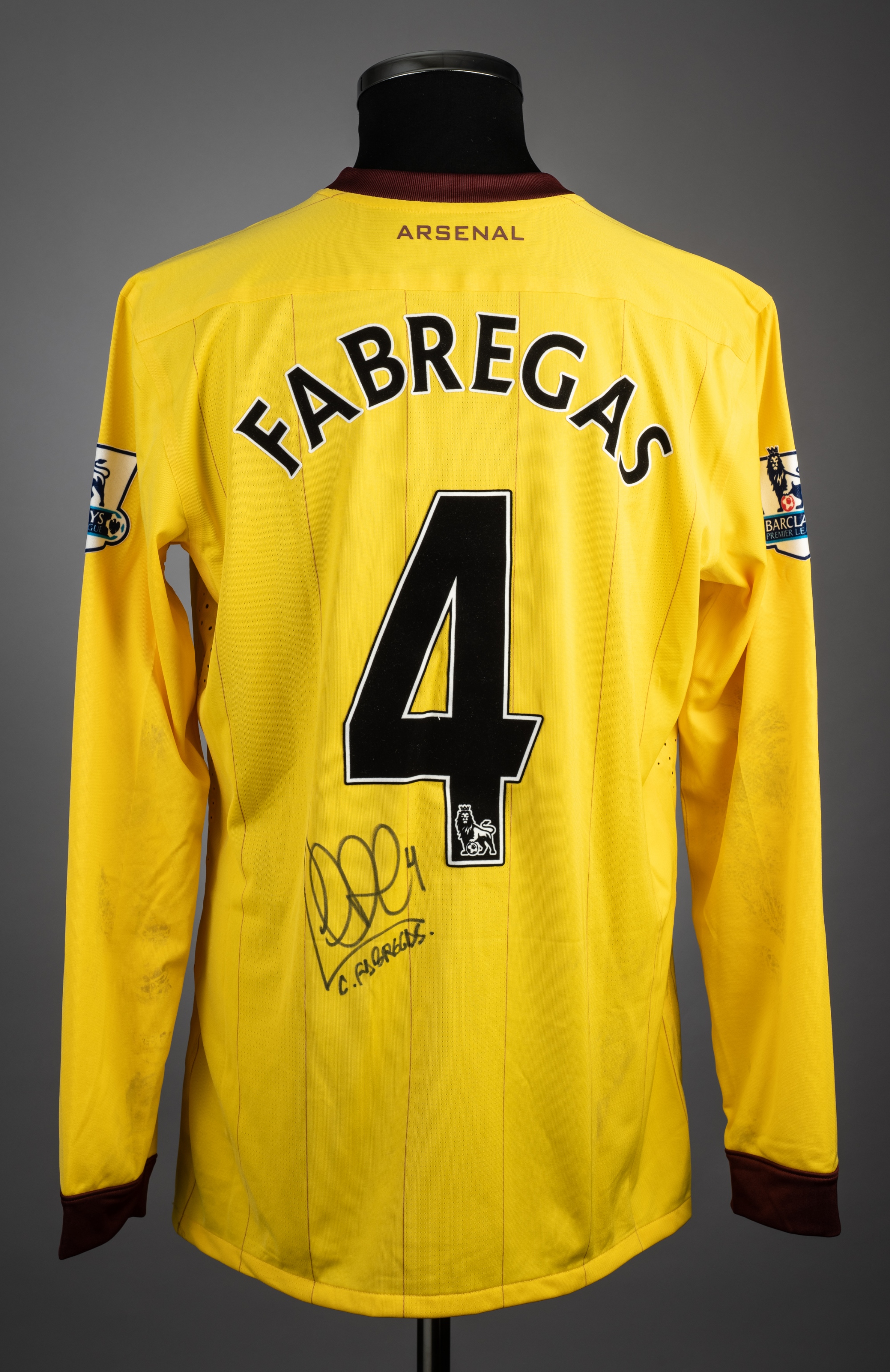 Cesc Fabregas's signed match-worn yellow Arsenal No.4 'poppy' jersey from the match v Everton played at Goodison Park, 14th November 2010, Nike, size L G G, long-sleeved, Premier League badges, poppy motif inscribed ARSENAL REMEMBERS, EVERTON v ARSENAL, 14th NOVEMBER 2010, signed twice by Fabregas to front and rear, the reverse lettered FABREGAS Fabregas scored the 2nd and decisive goal in this match.