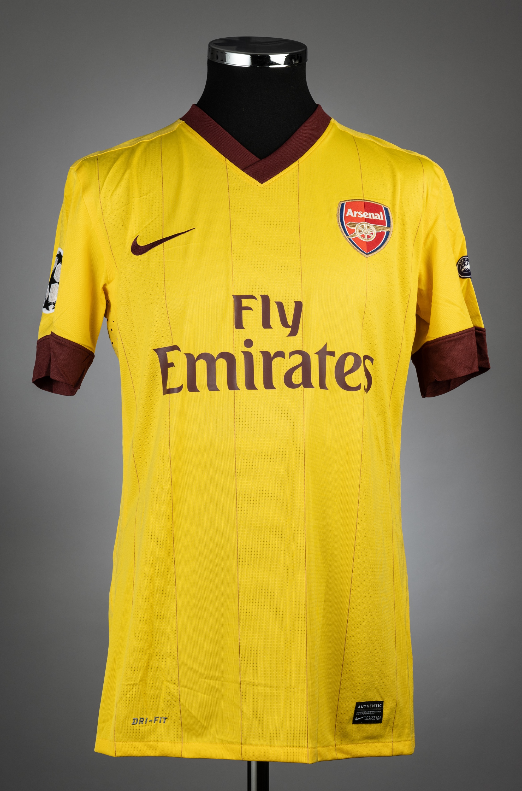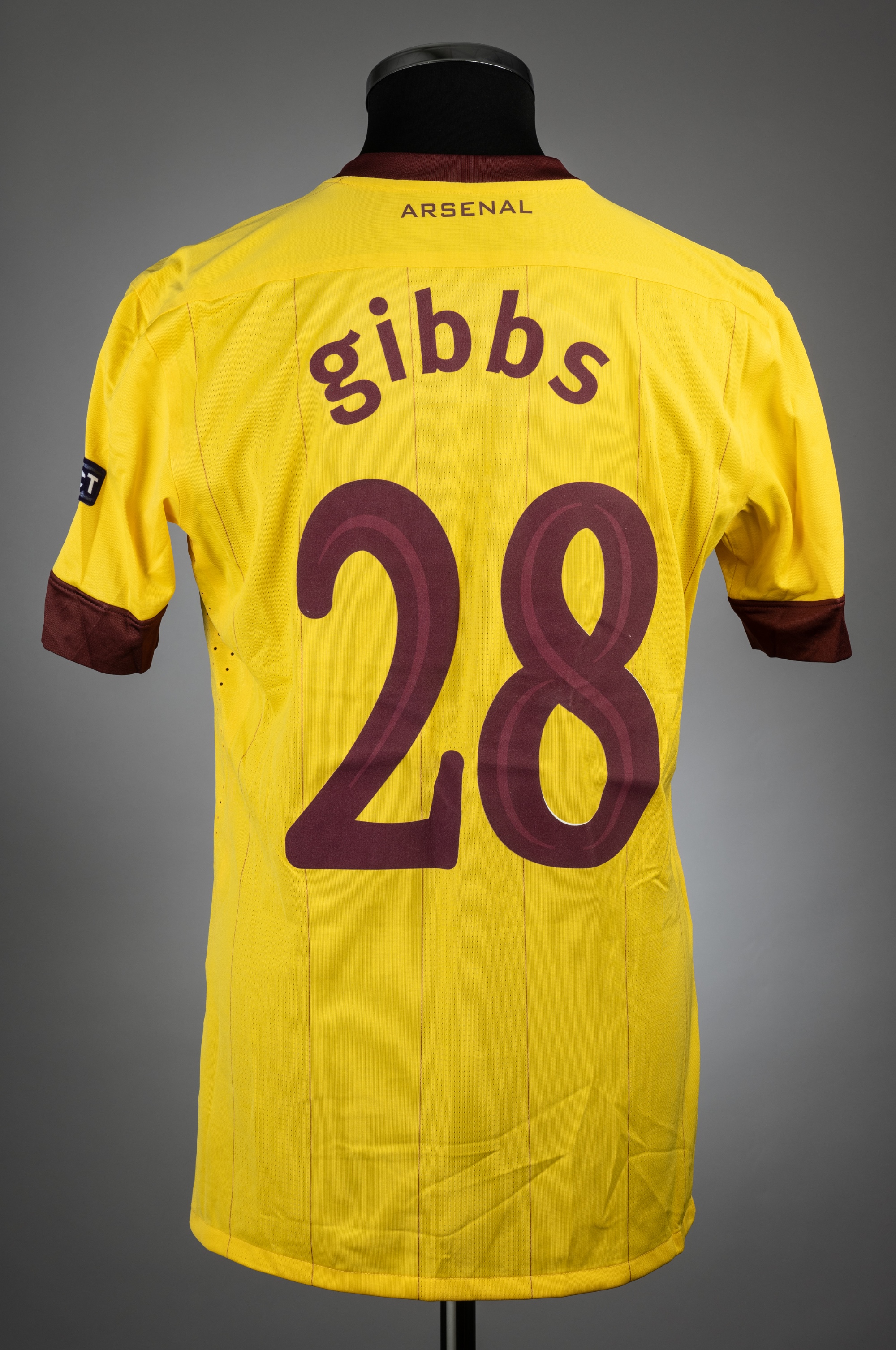 Kieran Gibbs yellow & claret Arsenal UEFA Champions League no.28 jersey v Sporting Braga, played at AXA Stadium, 23rd November 2010, match issue, Nike, short-sleeved with UEFA STARBALL and RESPECT sleeve badges, club crest and sponsor logo, reverse lettered GIBBS, size M, marker stain to reverse Sporting Braga defeated Arsenal 2-0.