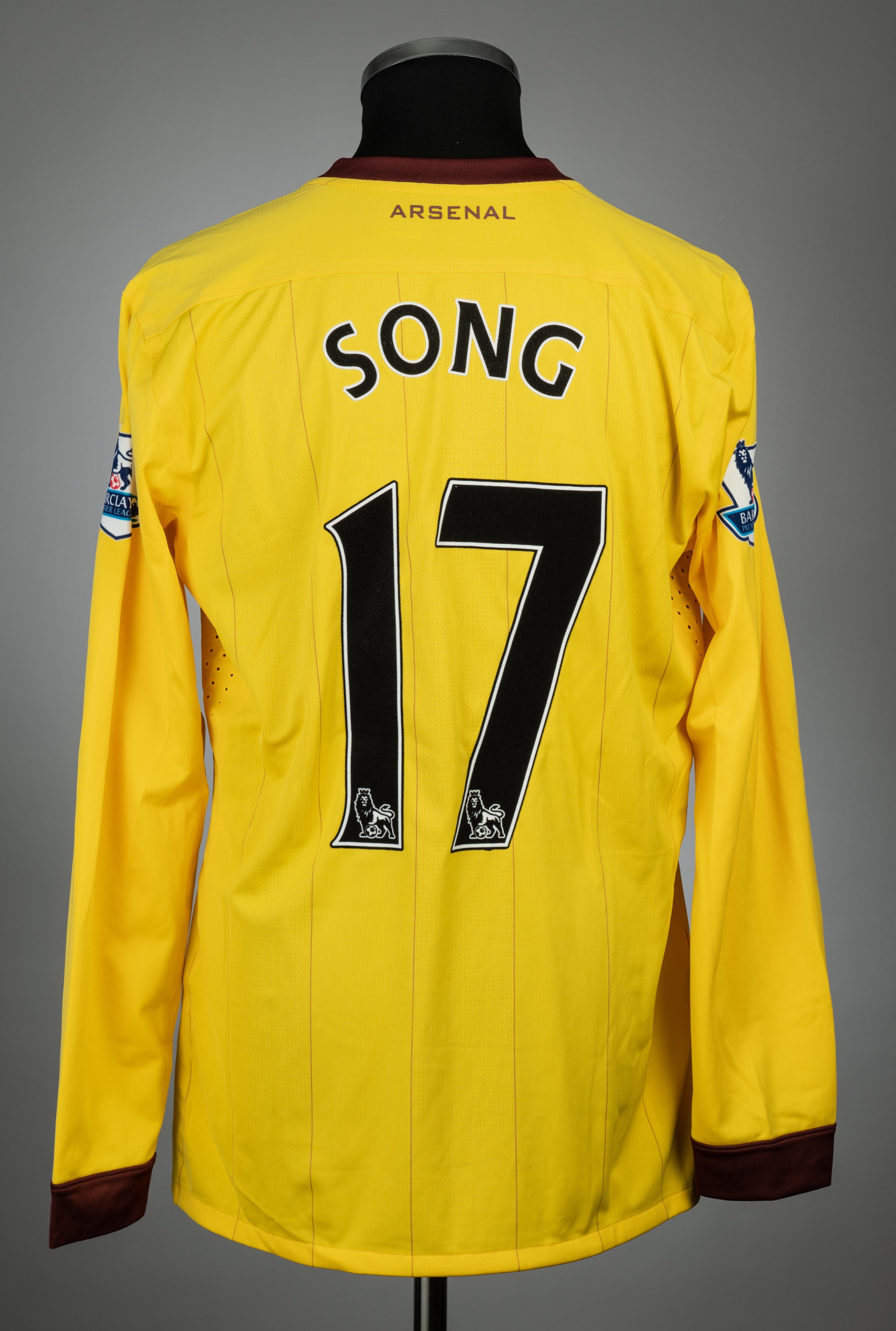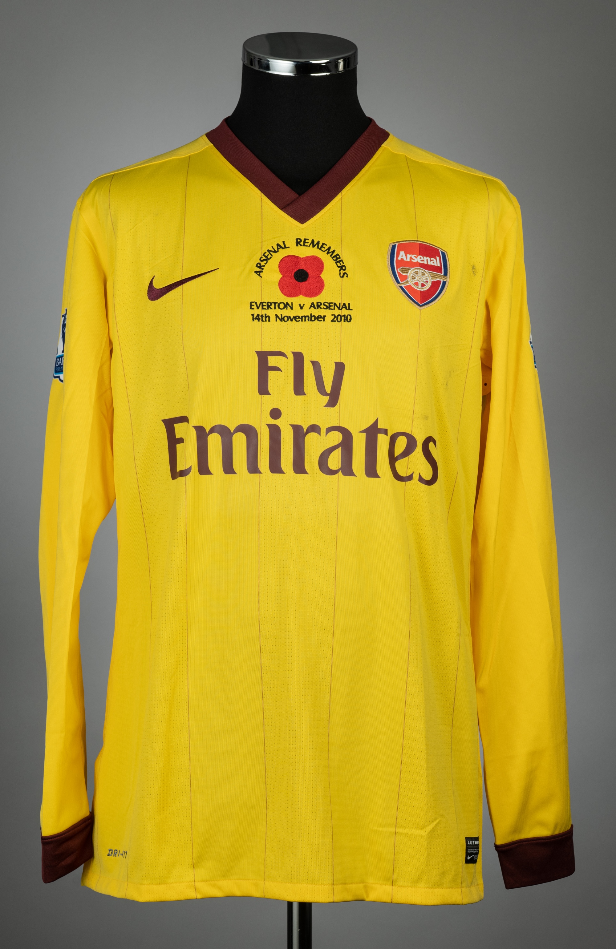 Alex Song yellow & claret Arsenal no.17 Poppy jersey, v Everton, played at Goodison Park, 14th November 2010, match issue, Nike, long-sleeved with BARCLAYS PREMIER LEAGUE sleeve badges, embroidered with red poppy and ARSENAL REMEMBERS EVERTON V ARSENAL 14TH NOVEMBER 2010, club crest and sponsor logo, reverse lettered SONG, size L, bears some pitch marks to left shoulder area Arsenal defeated Everton 2-1.